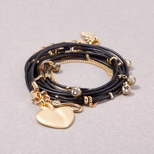 - Czarna bransoletka skórzana ozdobiona kryształkiem Swarovskiego i pozłacanym serduszkiem w kolorze złota.