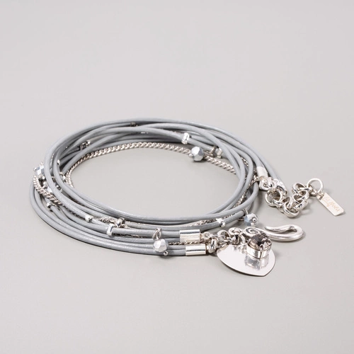 - Bransoletka owijana z szarej skóry z przywieszkami. Kryształy Swarovskiego i motyw serca. Rockowy styl, który ożywi każdą codzienną stylizację!