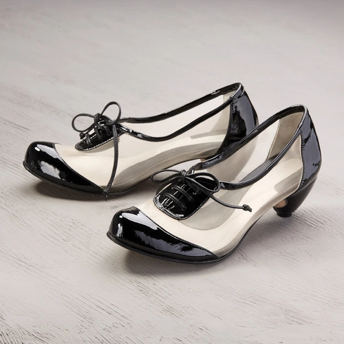 - Czarno-białe czółenka wykonane z naturalnej koźlej skóry i przewiewnej siateczki. Wiązane. Zrobione ręcznie w warsztacie w Sao Paolo z materiałów z odzysku. Dla kobiet, które nie boją się iść pod prąd! Do różowych cygaretek, na co dzień.
