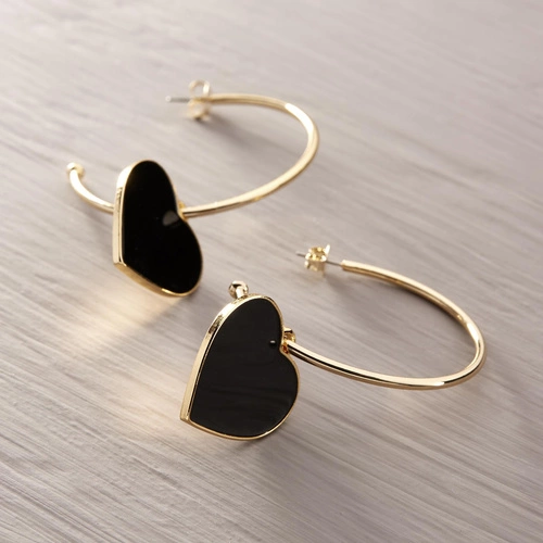 - Pendientes de aro de acero obredorado. Decorados con colgantes con corazones negros. Los colgantes se pueden quitar. Los recomiendo con camisa blanca y puritos negros o pantalones cortos de mezclilla. Para una amiga.