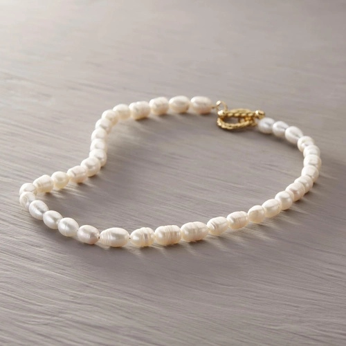 - Collar de perlas cultivadas. De forma simple con un cierre delicado. Acero sobredorado. Ligero y cómodo de llevar. Lo recomiendo con un segundo collar hecho de una delicada cadena. Una composición perfecta para camisetas sencillas. Un clásico atemporal.