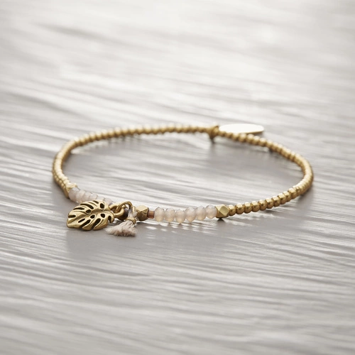 - Drobna bransoletka z koralików w kolorze złotym. Dekor w kształcie charakterystycznego liścia monstery.