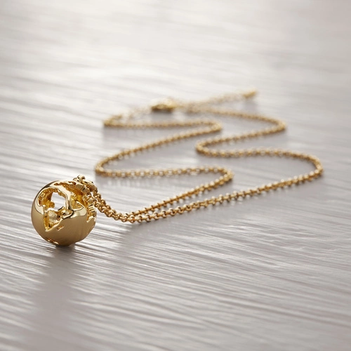 - Krótki wisiorek na łańcuszku, z dekorem w kształcie kuli ziemskiej wykonanym z mosiądzu biżuteryjnego pokrytego 24-karatowym złotem. Niech migocze na twoim dekolcie, kiedy w dżinsowej koszuli i martensach zdobywasz Machu Picchu.