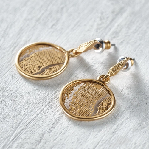 - Pozłacane kolczyki wiszące z motywem planu miasta. Kolor - żółte złoto. Dla nowoczesnej romantyczki, która lubi zagubić się w tłumie na bulwarze wielkiego miasta. Załóż je do botków na koturnie i oversize'owego płaszcza z printem. Urban style!