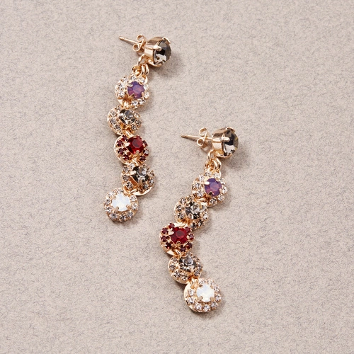 - Pendientes colgantes y llamativos,formados por cristales de Swarovski multicolores dispuestos en un motivo floral.Hechos de latón sobredorado.Su brillo será perfecto para una gran salida,pero los colores pastel permiten usarlos todos los días con vaqueros