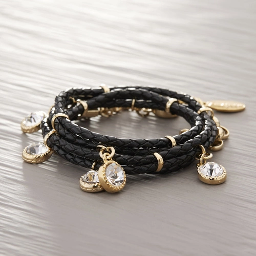 - Pleciona bransoletka ze skóry w kolorze czarnym, ozdobiona kryształkami Swarovskiego. Idealna do pudrowego różu i pastelowych paznokci.