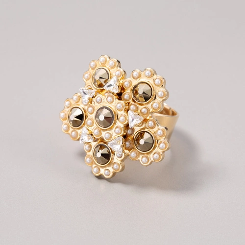 Złocony pierścionek z kwiatami z perłami i kryształkami