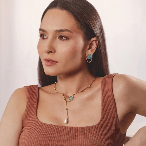 Pozłacany naszyjnik z perłą i błękitnym agatem