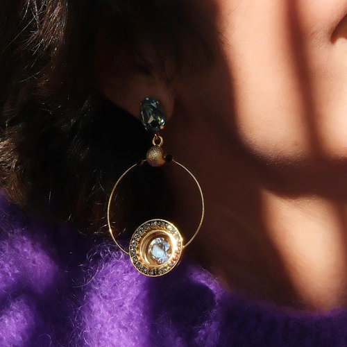Złocone kolczyki koła z białym, morskim i szarymii kryształami