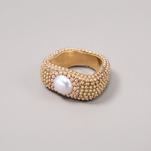 Pozłacany pierścień z perłą w oprawie z łańcuszków