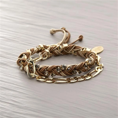 Złota bransoletka z brązowym i beżowym kordonkiem
