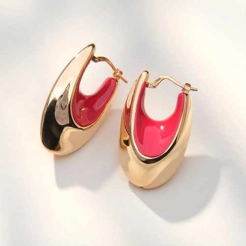 Owalne pozłacane kolczyki w emalii w tonie czerwonej dalii