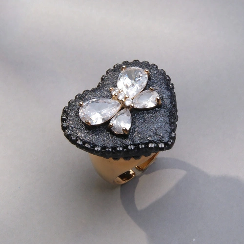 Złocony pierścień z czarnym sercem z motylem z cyrkonii