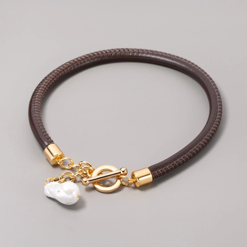 Naszyjnik z ciemnobrązowej ekoskóry z perłą hodowlaną