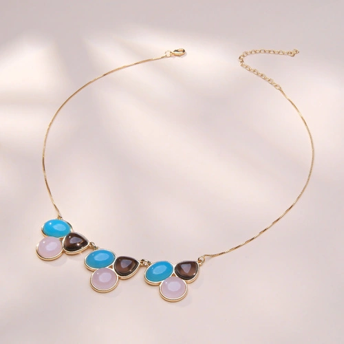 Krótki złocony naszyjnik z różowym i zielonym kwarcem