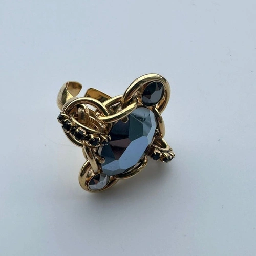 Złocony pierścionek z czarnymi kryształami i perełkami