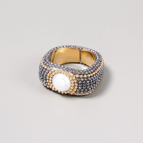 Pozłacany pierścień z perłą w oprawie z łańcuszków