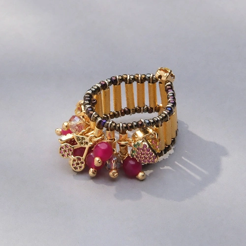 Złocony pierścionek z jadeitami, koralikami i kryształkami