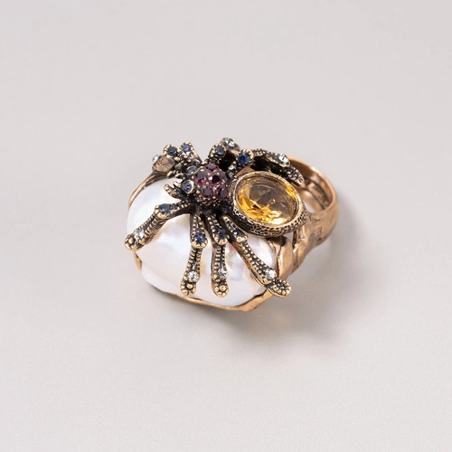 Pozłacany pierścionek z tarantulą na masie perłowej