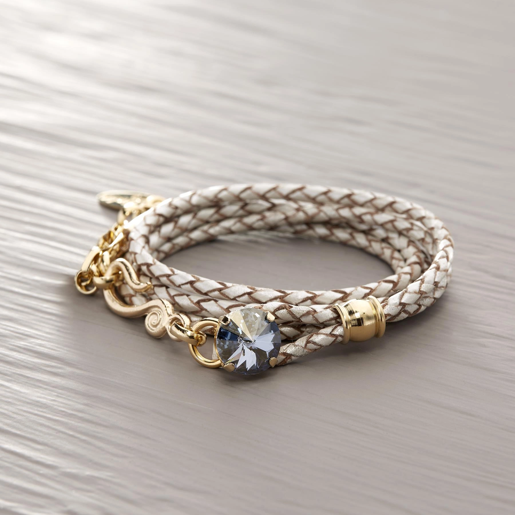 • Skórzana bransoletka wykonana z najwyższej jakości, perłowej skóry. Wykonana z mosiądzu, pozłacana. Piękny dekor stanowi kamień w kolorze jasnego nieba. Polecam z innymi bransoletkami w kolorze złota Mya Bay. Idealna na prezent dla przyjaciółki.