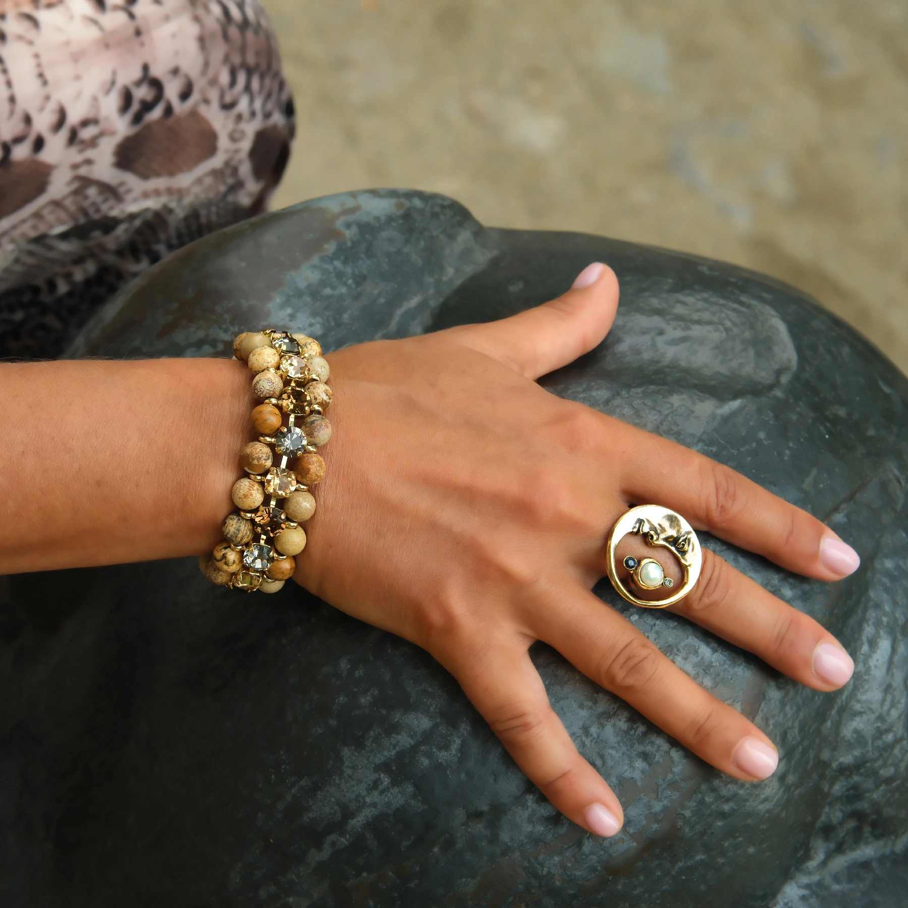• Trzyrzędowa bransoletka na sznurku z kulkami z naturalnych kamieni, kryształkami Swarovskiego i ozdobnymi akcentami z pozłacanego mosiądzu, z możliwością regulacji obwodu. Lekka i przyjemna w noszeniu. Idealna na prezent, bo pasuje do wszystkiego.