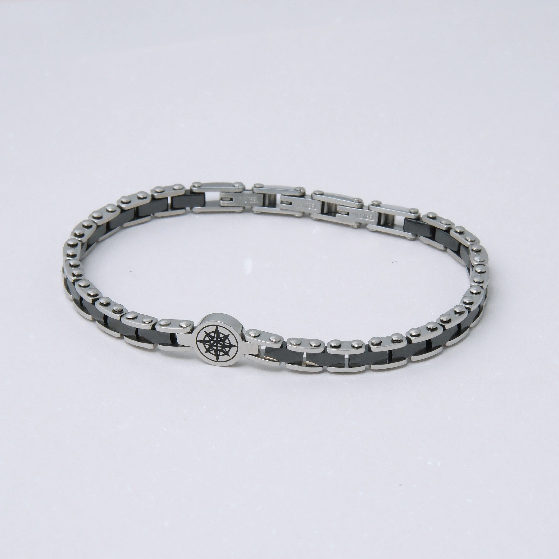Bransoletka z ogniw stalowych i ceramicznych, z różą wiatrów