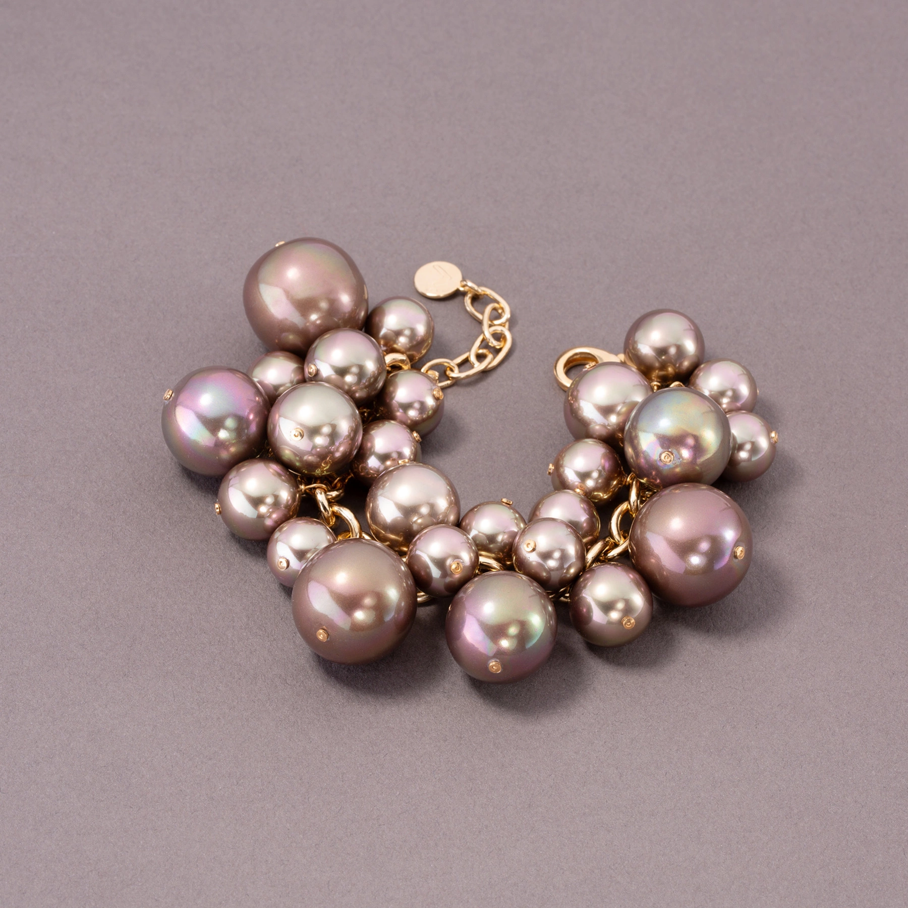 • Bransoletka na łańcuszku z pozłacanego mosiądzu z możliwością regulacji obwodu, z zawieszkami z różnej wielkości perłami z emalii perłowej w kolorze mokka. Piękny kawowy odcień brązu doskonale podkreśli jasne stylizacje. Ręczna praca artystów z Majorki.