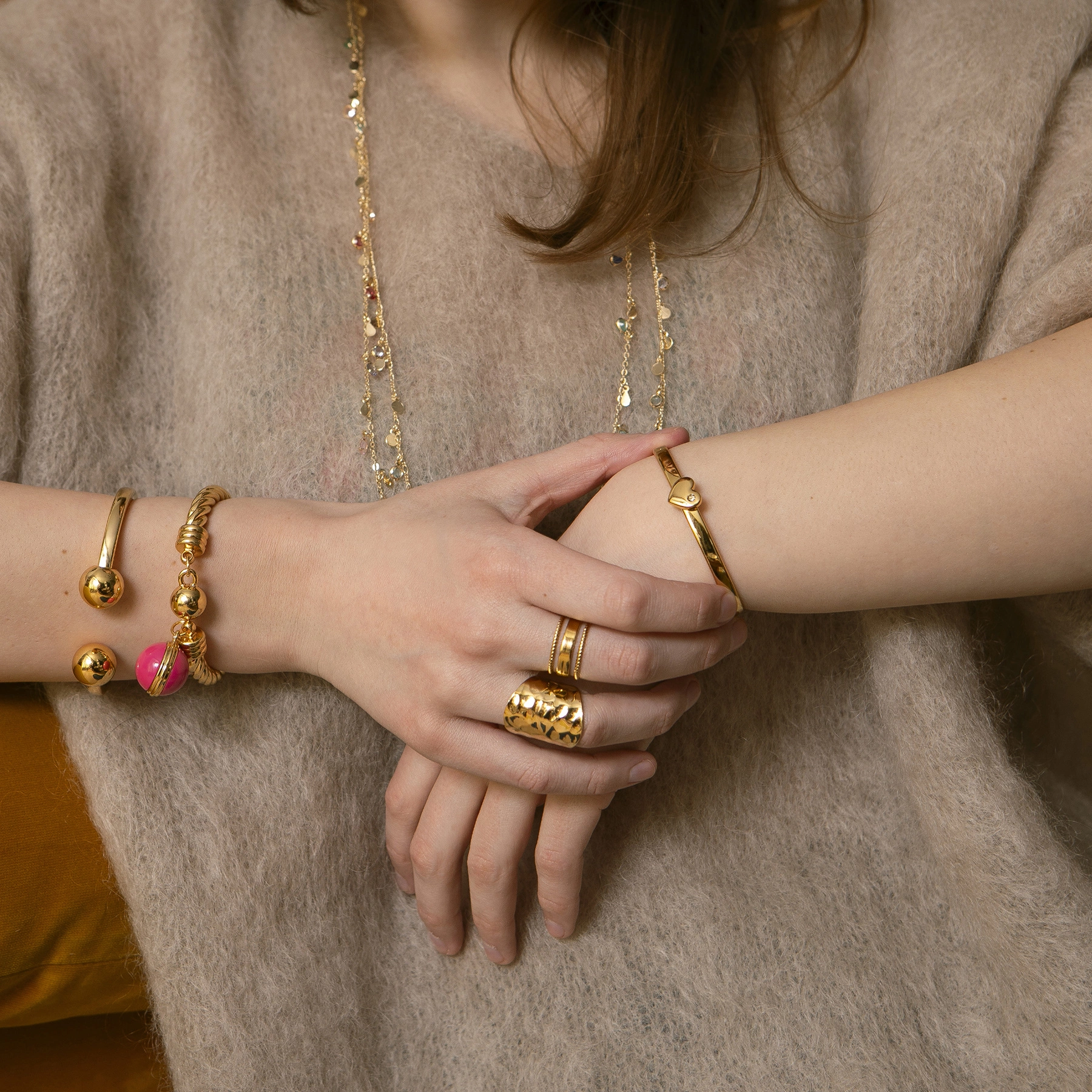 • Duży pierścionek wykonany z pozłacanego mosiądzu. Regulowany. O nieregularnym kształcie. Dla miłośniczki mocnych akcentów. Załóż go gdy chcesz się wyróżnić!