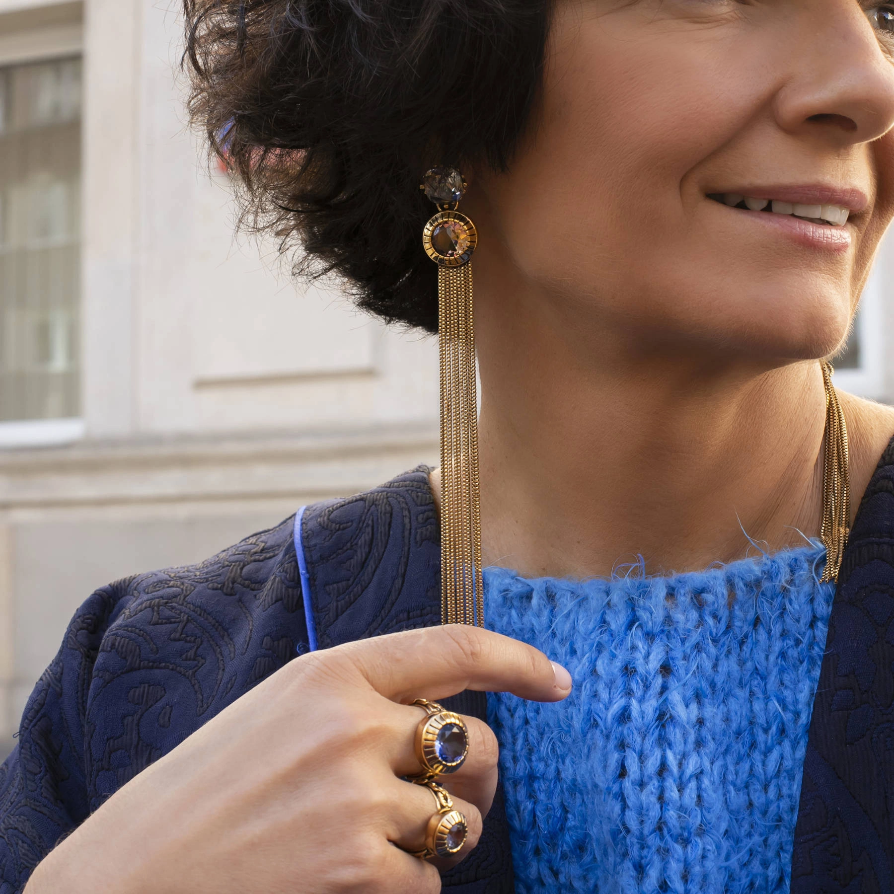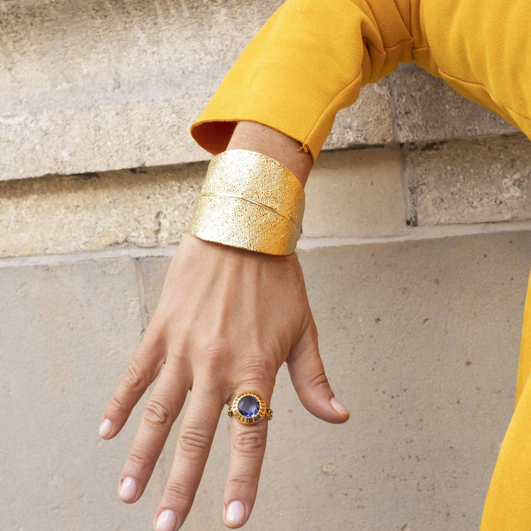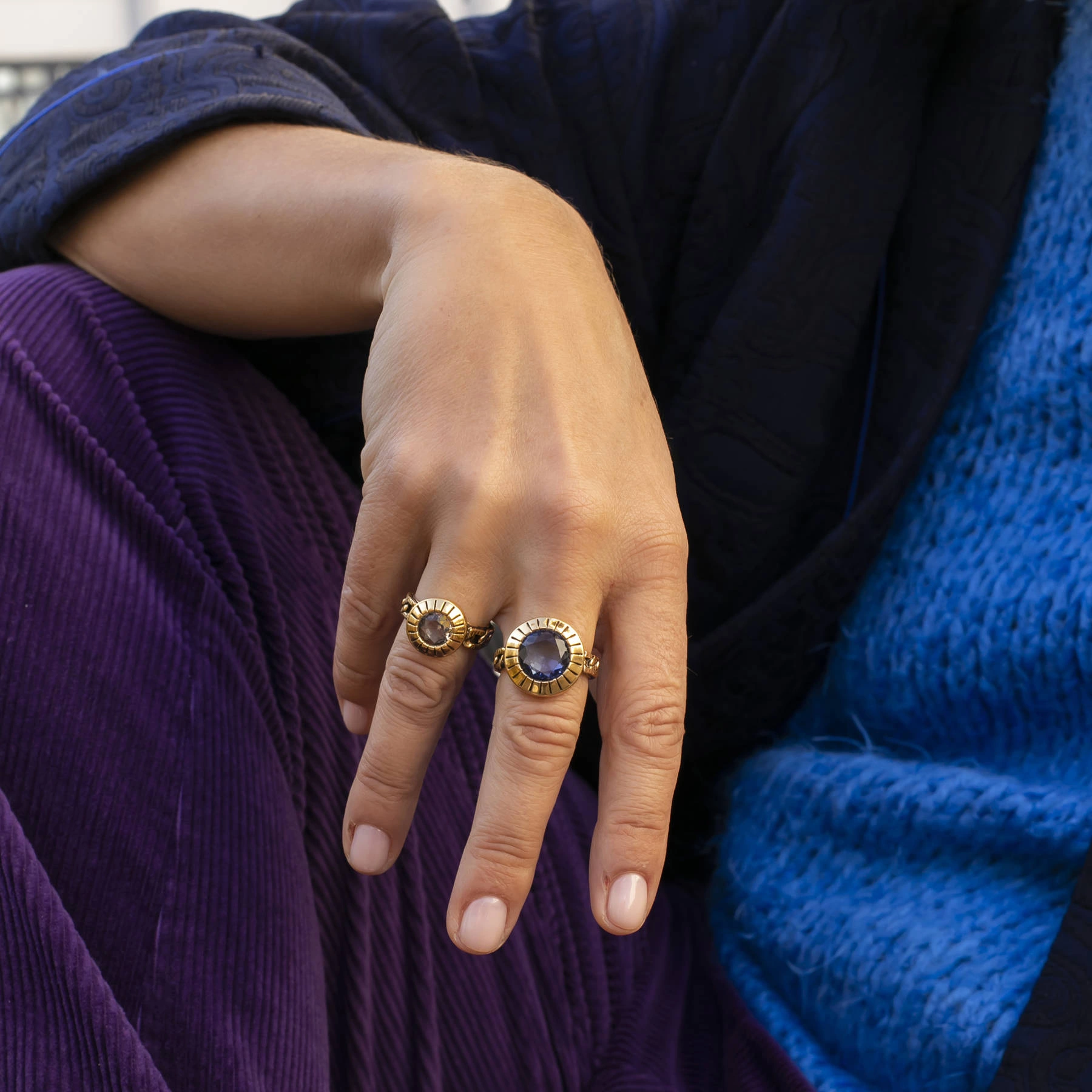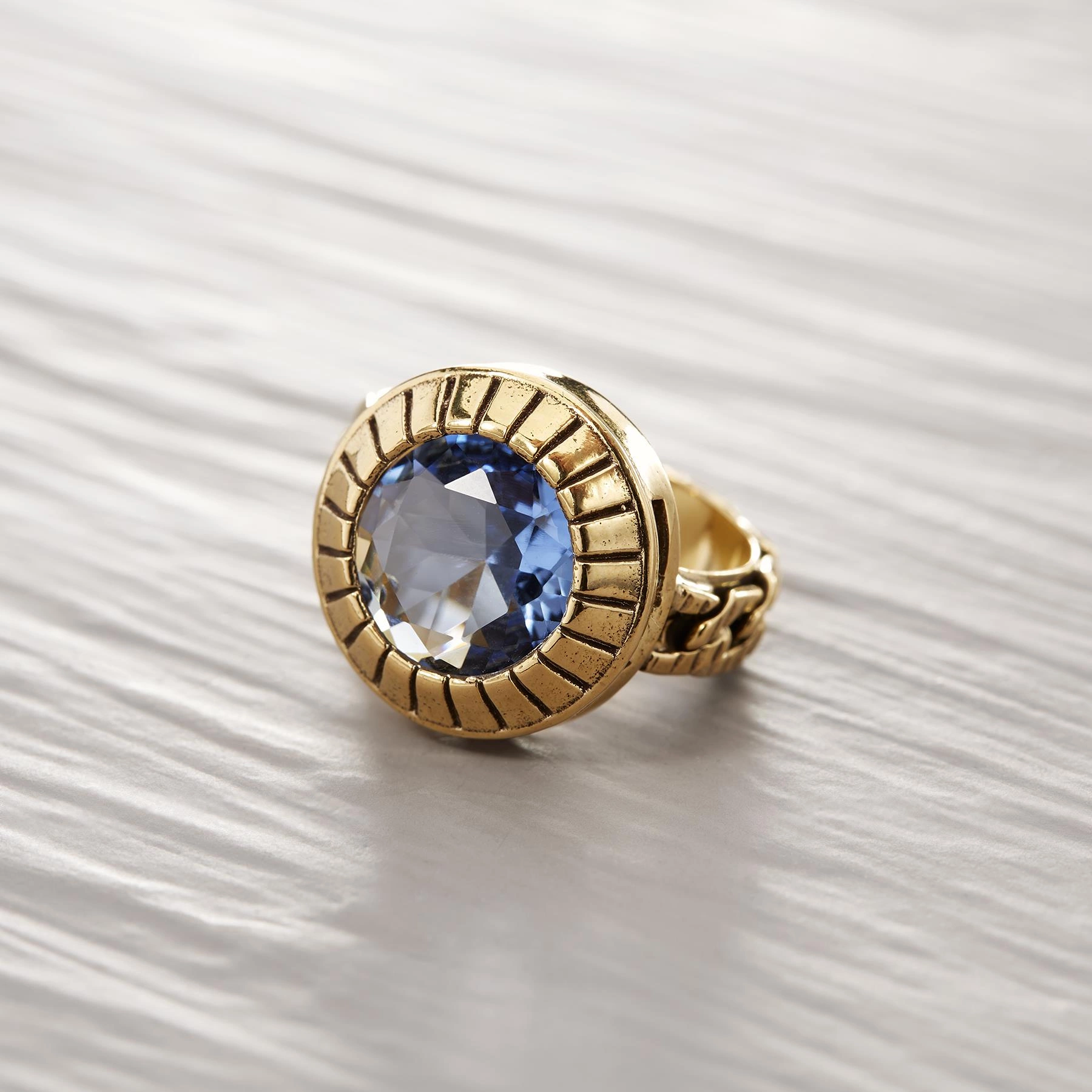 • Duży regulowany pierścionek wykonany ręcznie z pozłacanego mosiądzu z okrągłą koroną z ciemnoniebieskim kryształem Swarovskiego. Praca artystki z Sao Paulo.