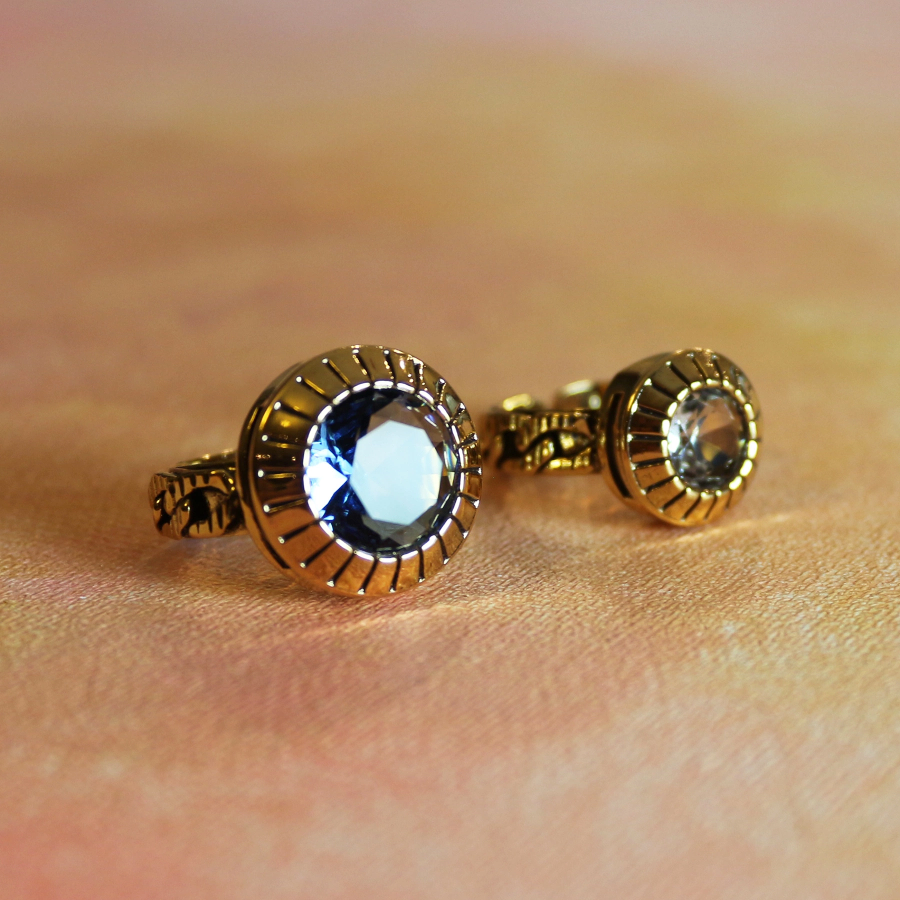 Duży złocony pierścionek z niebieskim kryształem. NIEBIESKIE OCZY