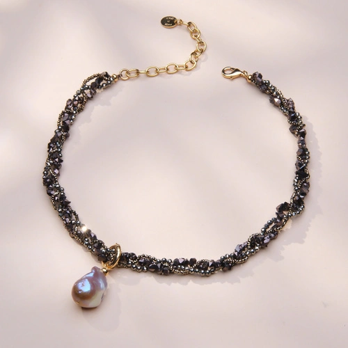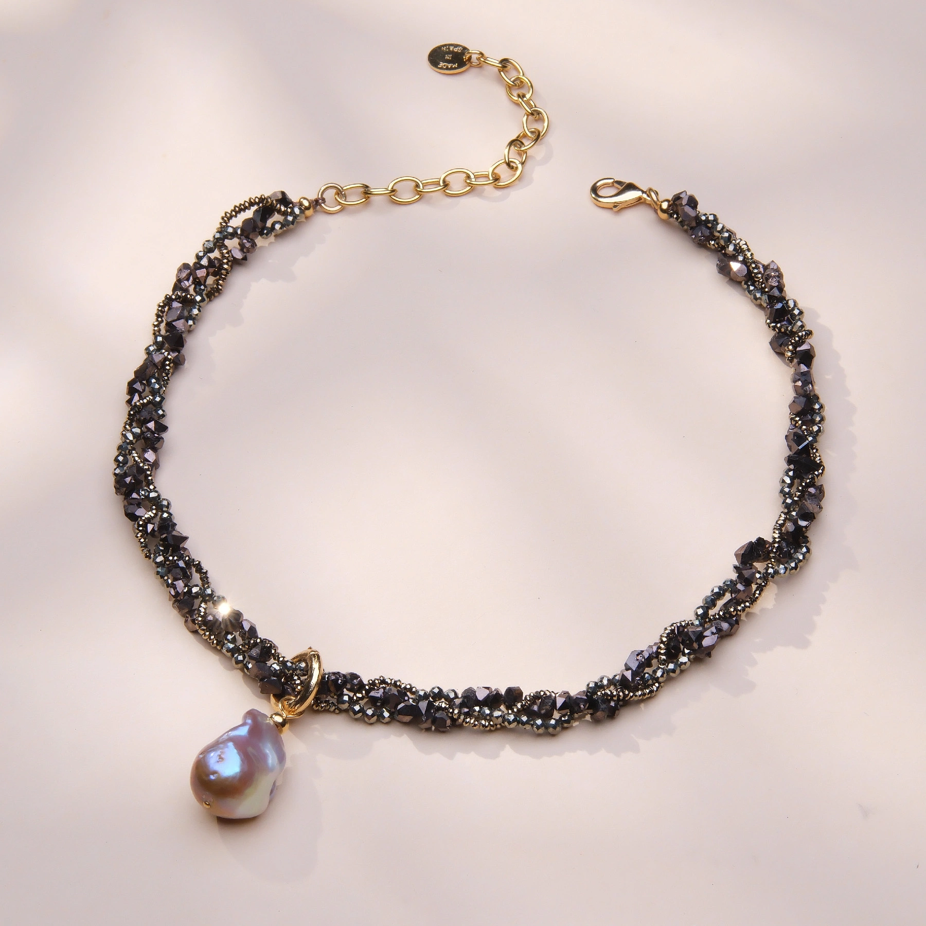 • Krótki naszynik na kulkowym łańcuszku z cyny platerowanej 18-karatowym złotem z ręcznie wplecionymi hematytami i kryształkami w kolorze szarego diamentu, z zawieszką z okazałą barokową perłą słodkowodną i przedłużką do regulacji długości. Z Barcelony.