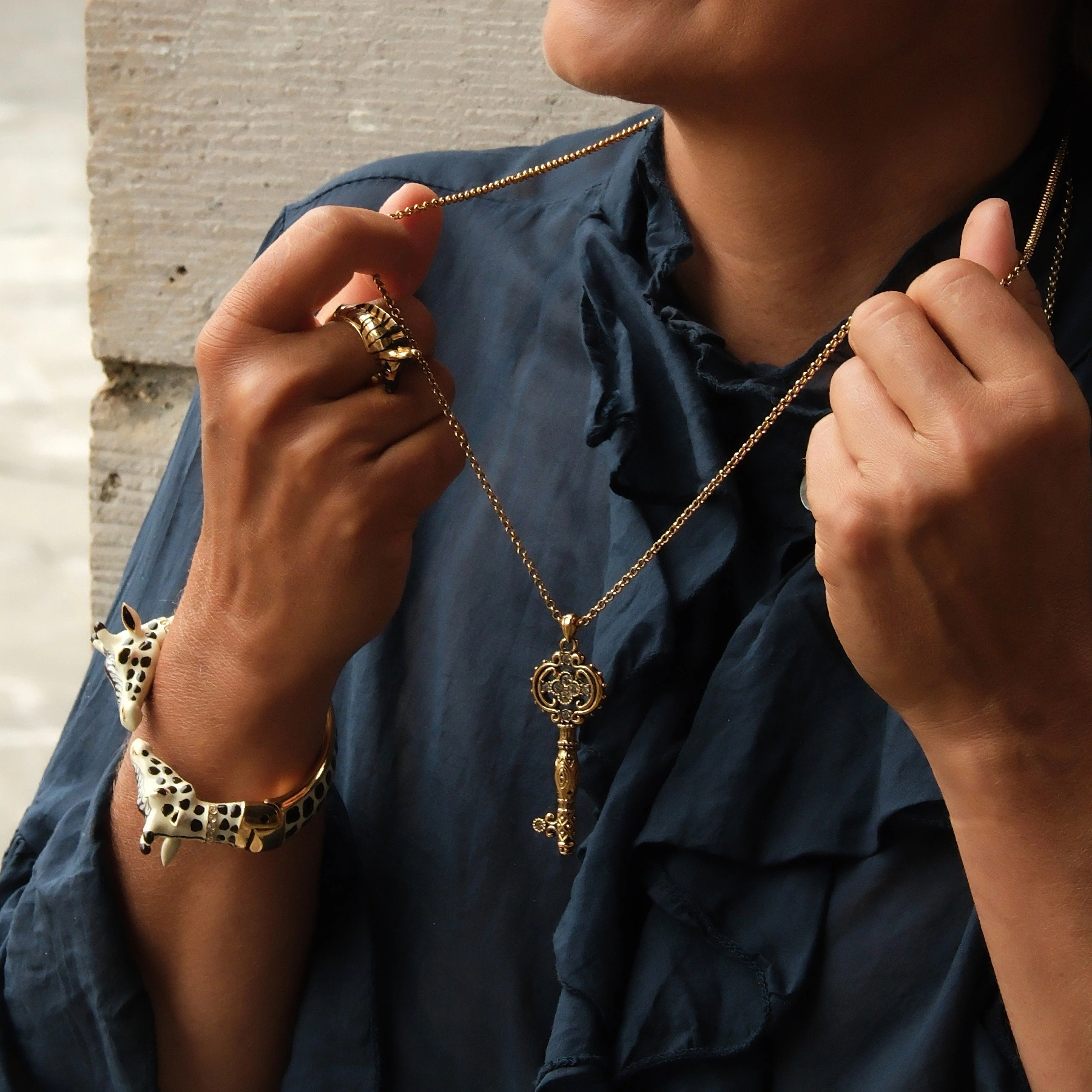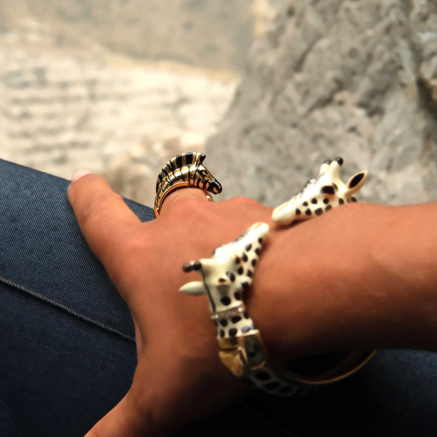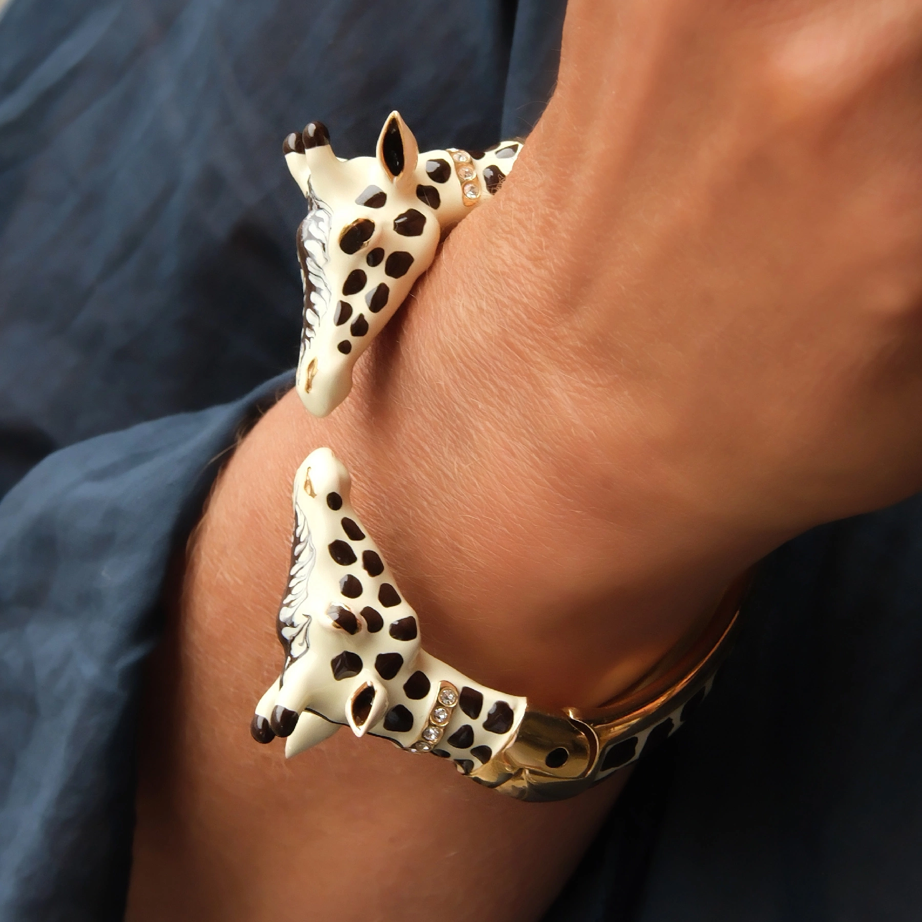 • Sztywna bransoletka wykonana z pozłacanego mosiądzu w całości emaliowana ręcznie na podobieństwo umaszczenia żyrafy, z dwiema jej głowami naprzeciw siebie. Dla kobiet, które mają szersze spojrzenie.
