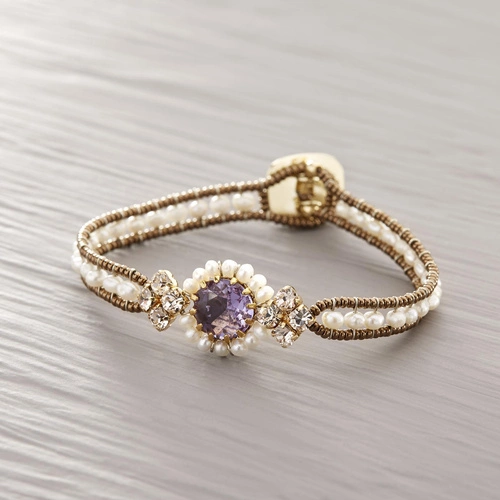 • Bransoletka z pozłacanego mosiądzu. Ozdobiona lawendowym kryształkiem Swarovskiego i mikroperełkami słodkowodnymi.