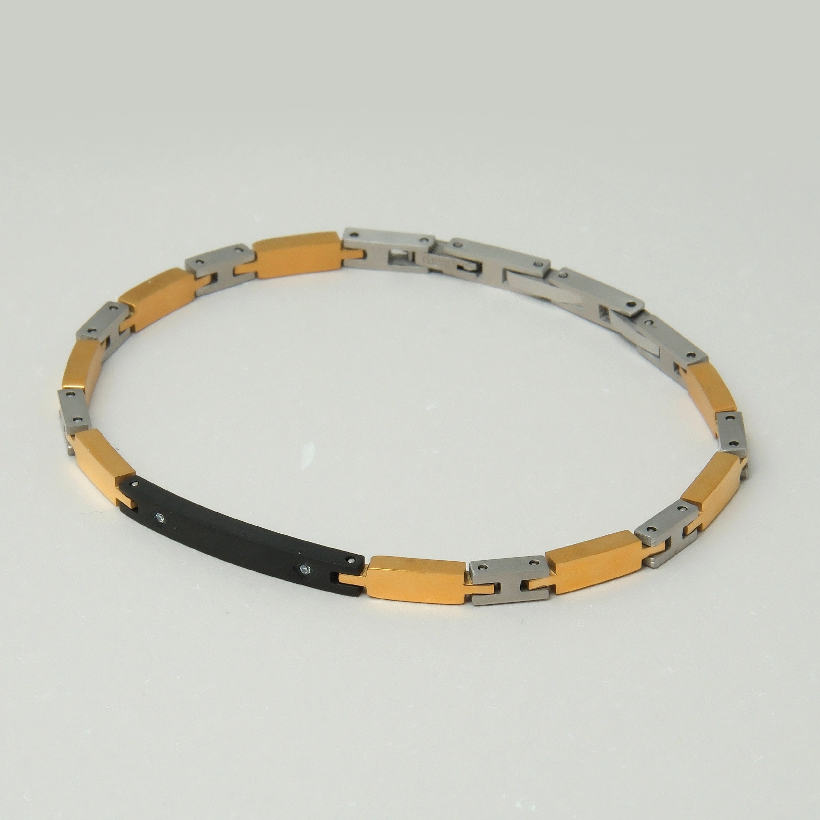 • Bransoletka męska wykonana z czarnego oraz pozłacanych i posrebrzanych modułów z najwyższej jakości stali szlachetnej. Klasyczny i ponadczasowy dodatek do noszenia na co dzień.