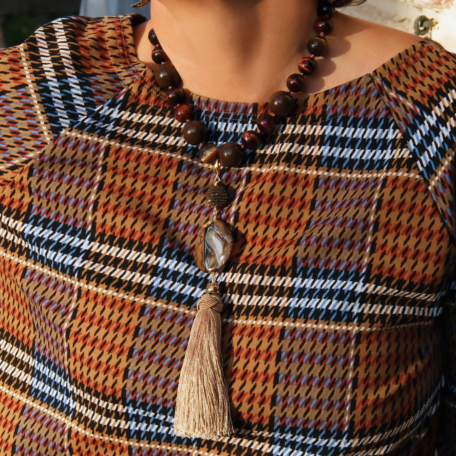 • Naszyjnik z korali w różnych odcieniach brązu z zawieszką z okazałym kamieniem naturalnym - agatem, zwieńczoną słomkowym chwostem, i elementami z pozłacanego mosiądzu. Rękodzieło mistrzów jubilerskiego rzemiosła z Lombardii.