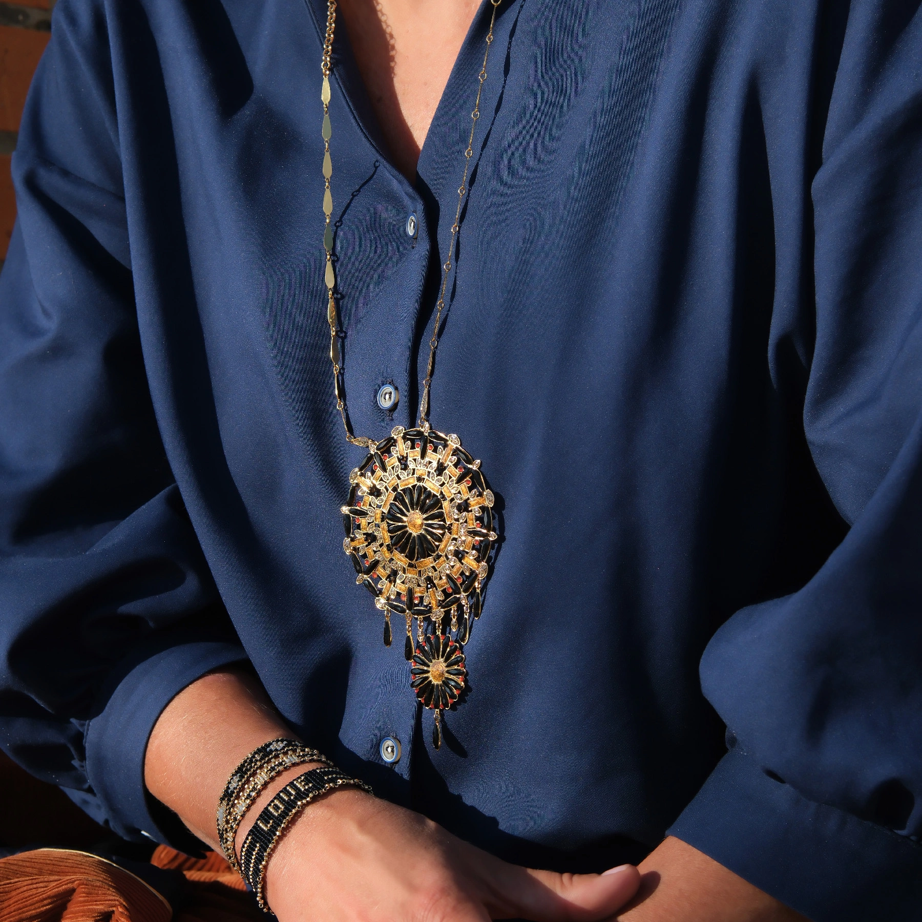 Naszyjnik z rozetą i kwiatem z kryształów i czarnych płatków