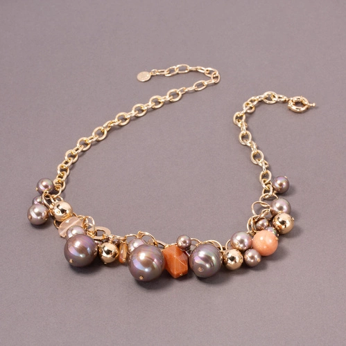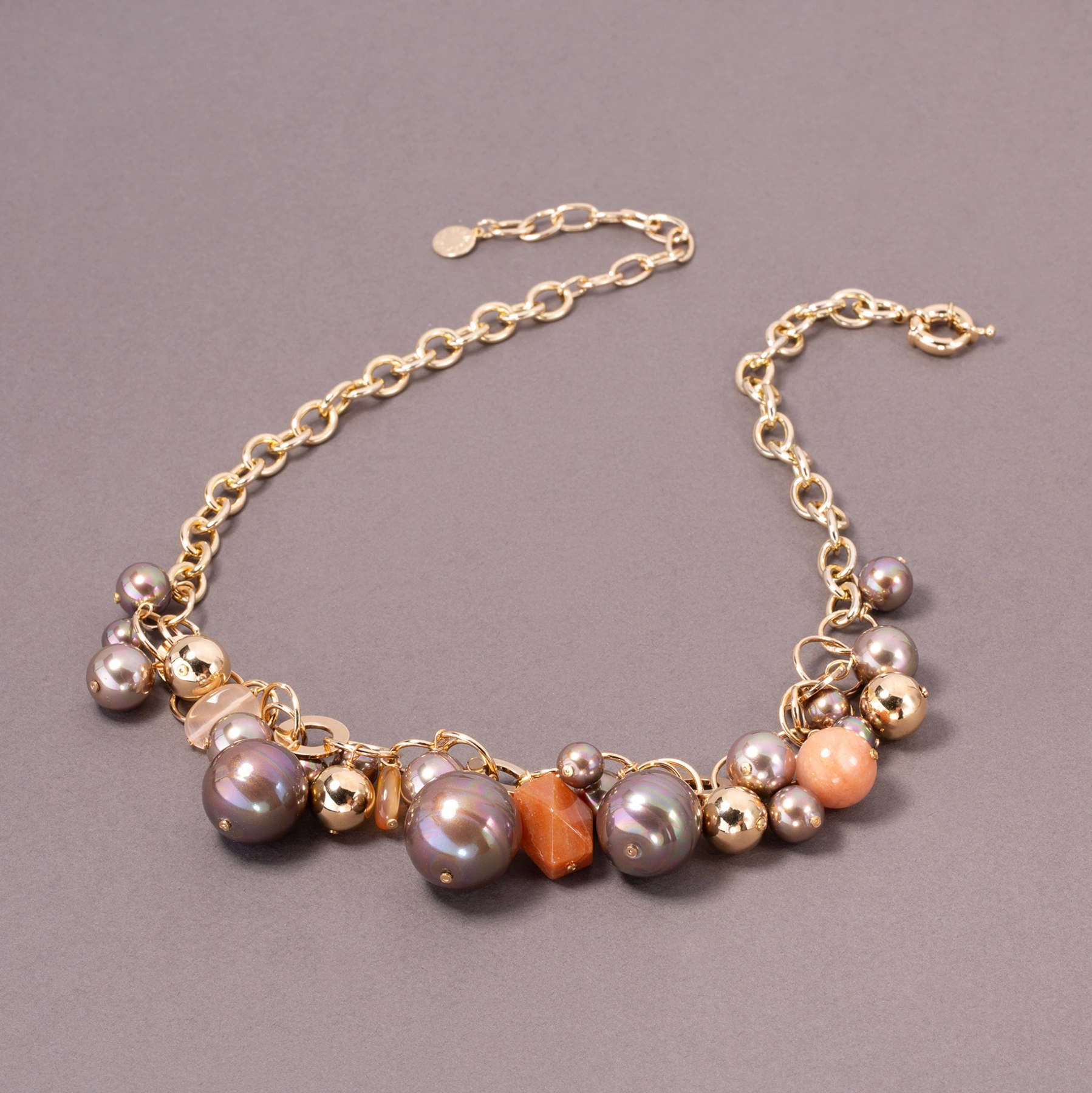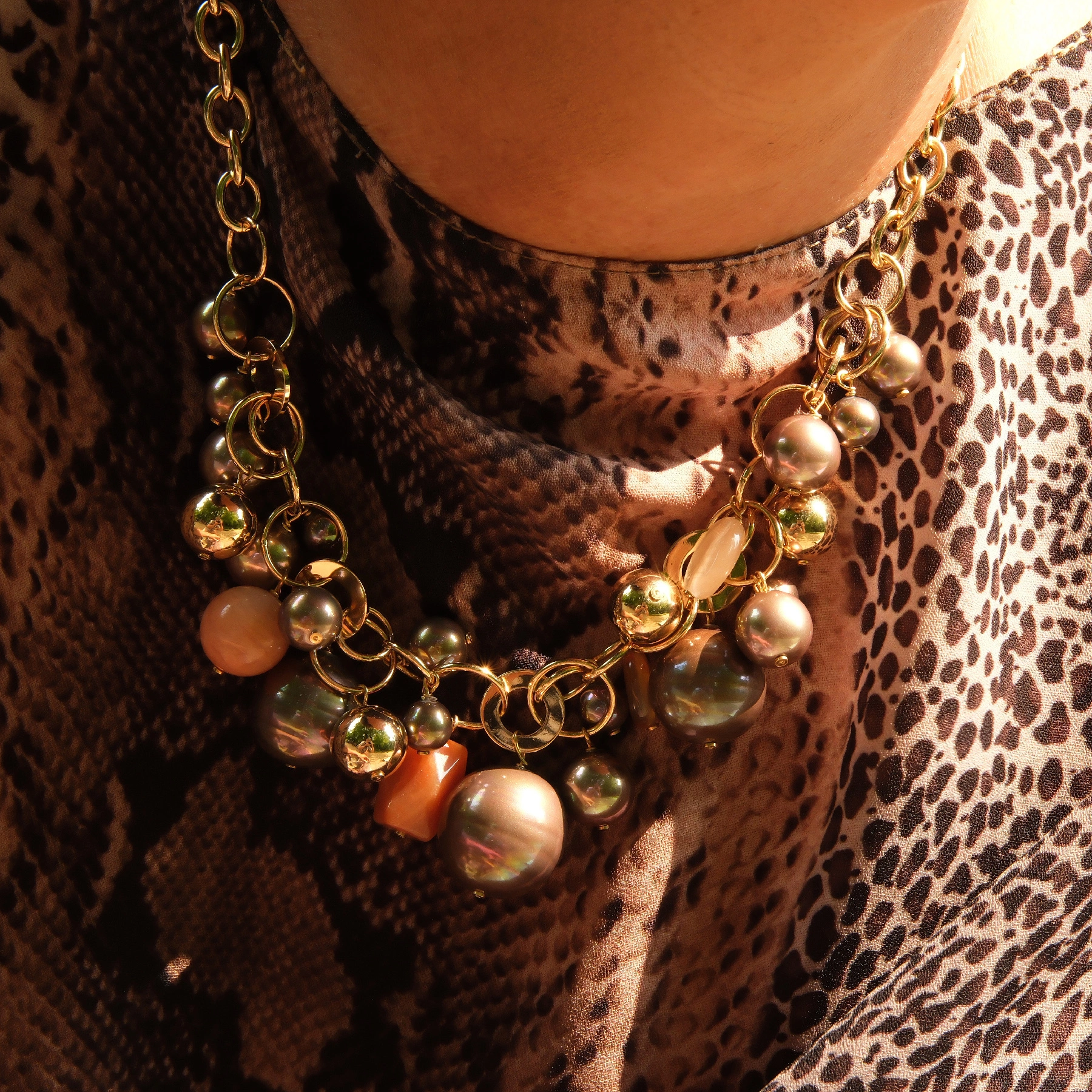 • Krótki naszyjnik na łańcuszku z pozłacanego mosiądzu z licznymi zawieszkami z perłami z emalii perłowej różnej wielkości w kolorach mokka, złotym i łososiowym, i kolorowymi kamieniami, z możliwością regulacji długości. Rękodzieło z majorkańskiej pracowni.
