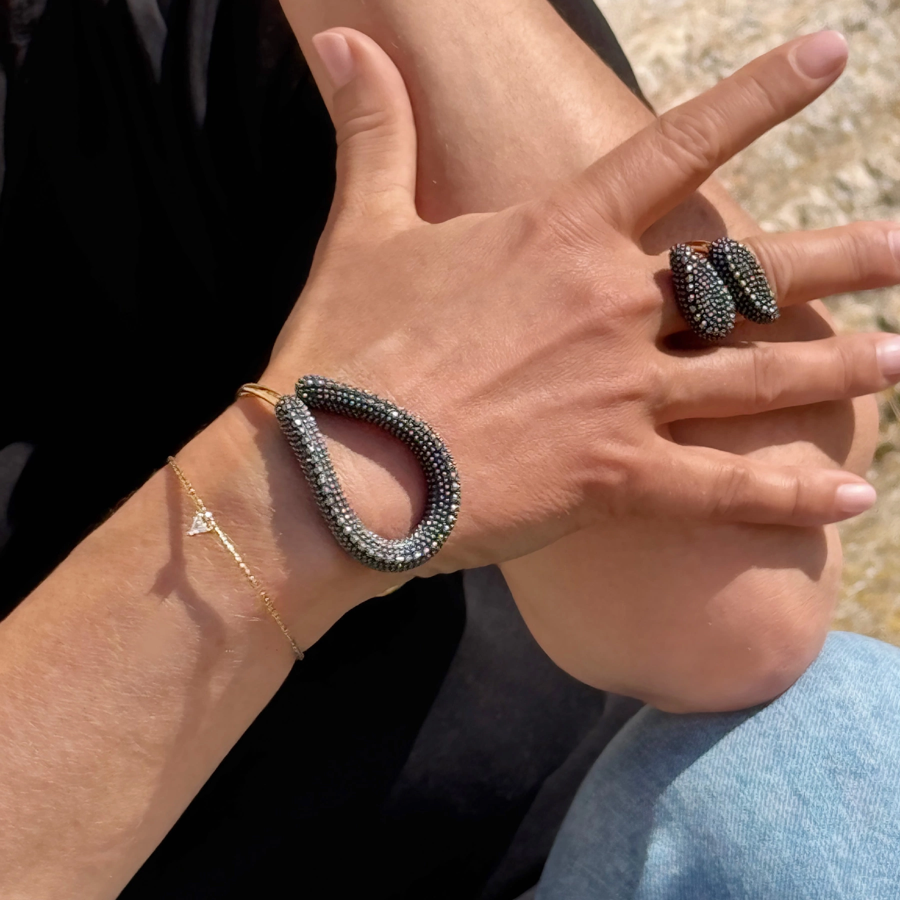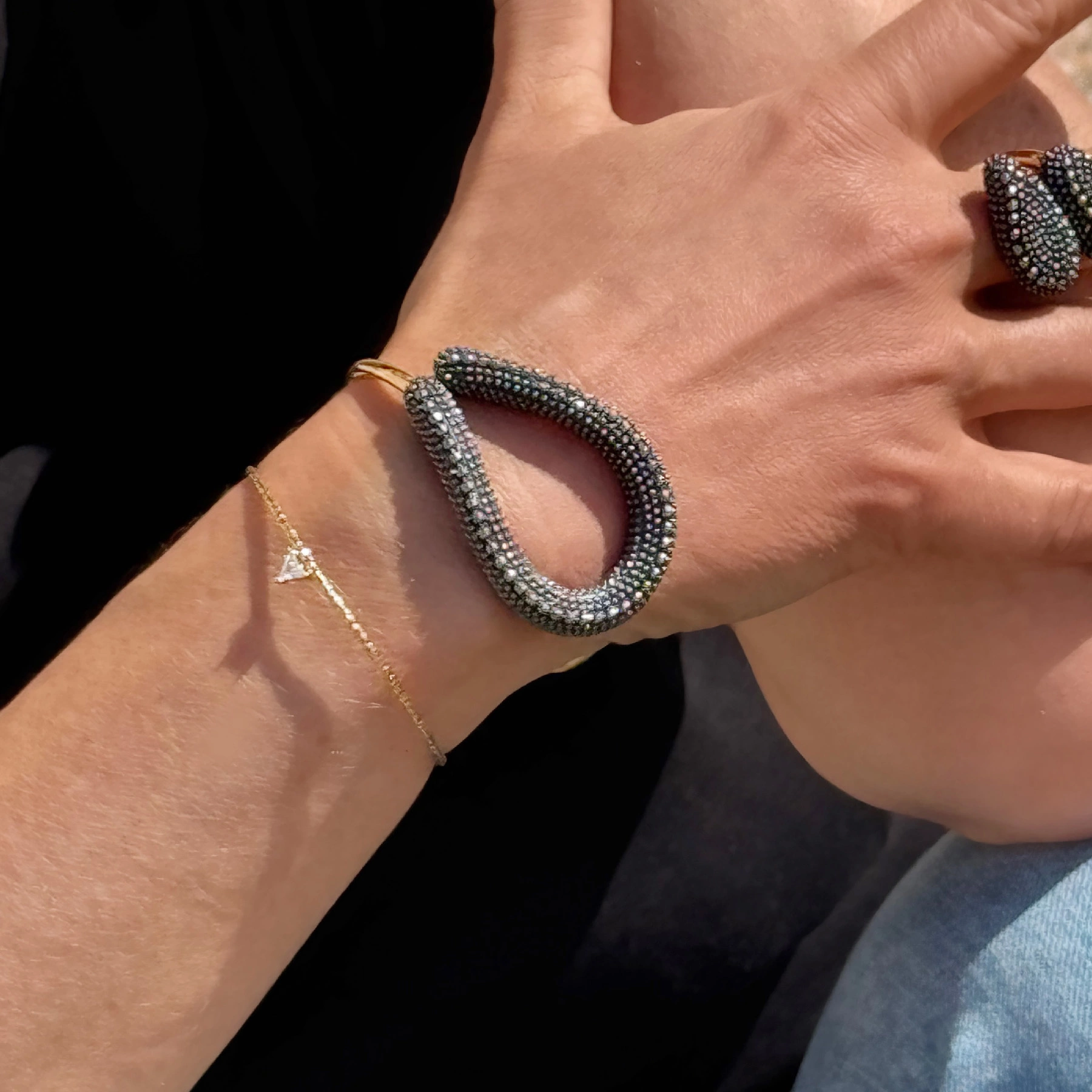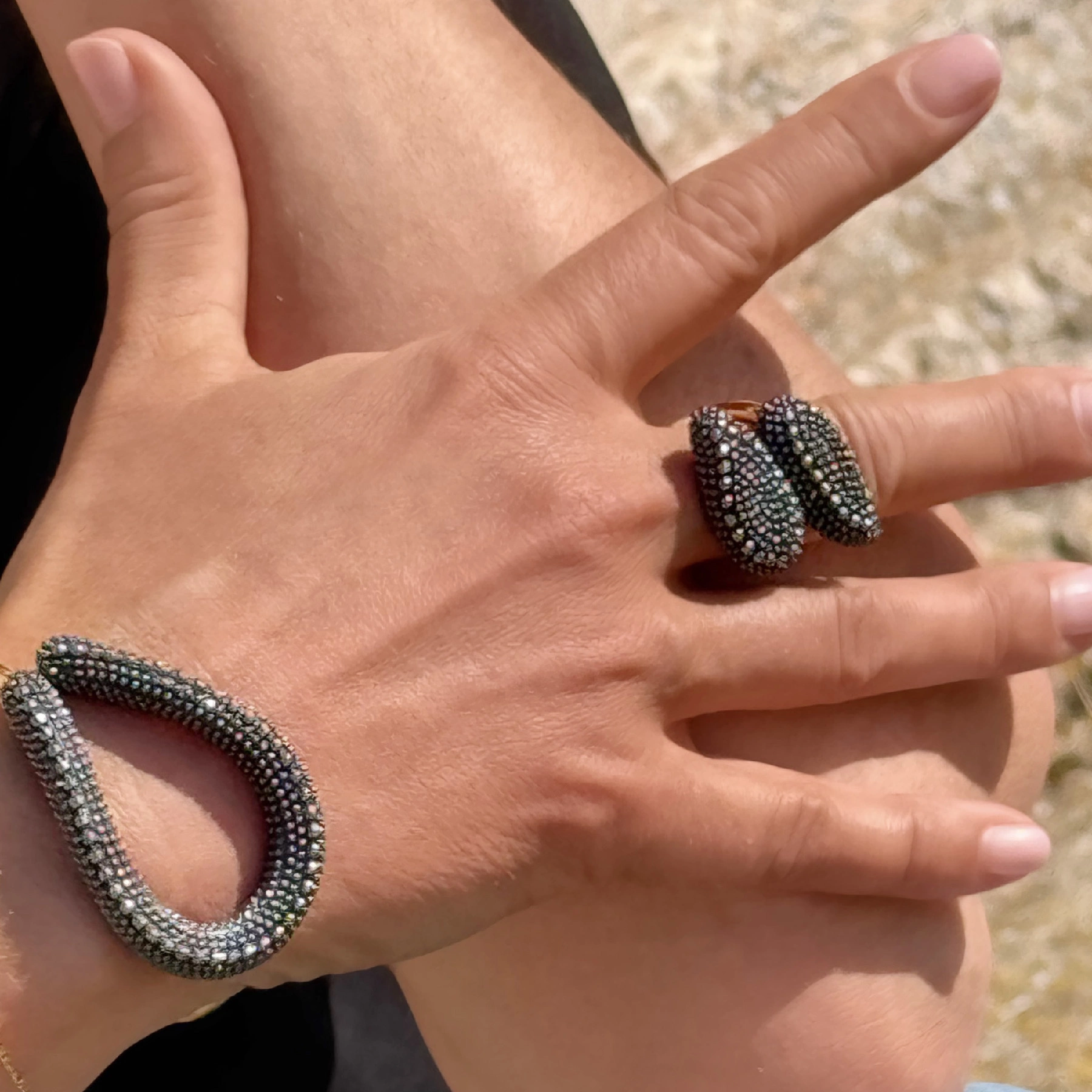 Daniela i jej mąż Francesco to przemiła para pasjonatów biżuterii. Ponad 10 lat temu otworzyli jubilerską pracownię w małym miasteczku w samym sercu Umbrii, krainy oliwy, wina i mody. Długo eksperymentowali z różnymi tworzywami, aby w końcu osiągnąć zamierzony efekt. Wykonywane przez nich niektóre wyroby wymagają specjalnej techniki konstrukcyjnej. Polega ona na pokrywaniu bazy z pozłacanego mosiądzu dwuskładnikową żywicą. Następnie jest ona pigmentowana proszkiem nadającym jej połysk i emaliowana. W dalszej kolejności w zależności od projektu aplikowane są na nią różne dekory. Podstawową ozdobę stanowią diamentowe łańcuszki tworzące oprawę dla pereł, kamieni naturalnych i motywów układanych z kryształków. To bardzo pracochłonna, całkowicie ręczna praca, za to skutkująca absolutnie unikatową biżuterią. Dodajmy, że bardzo wygodną. Bo jak wyznaje Daniela „Tworząc przedmiot, który podkreśla kobiece piękno, ważne jest, aby myśleć o komforcie jego noszenia”.