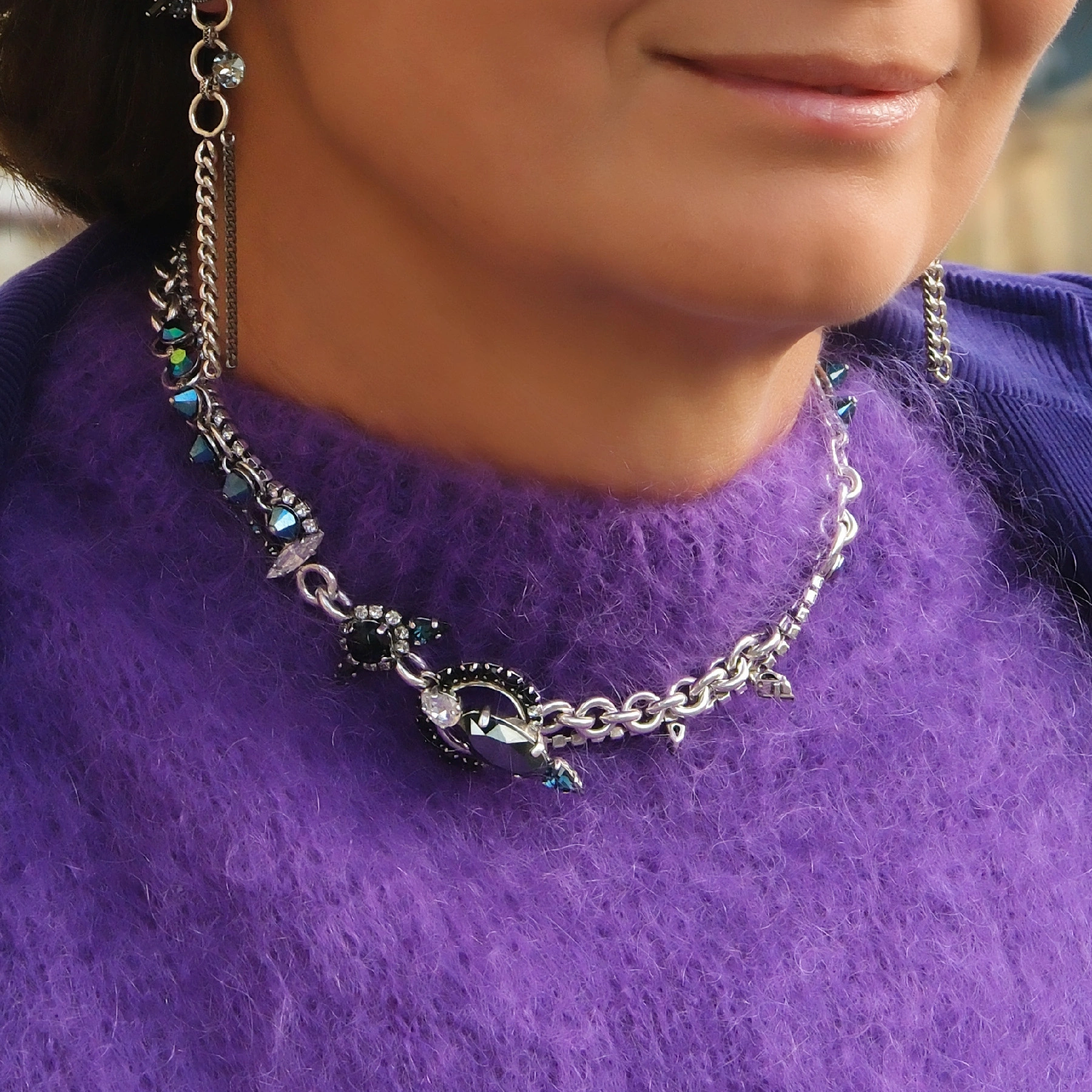 • Naszyjnik wykonany ręcznie z posrebrzanego mosiądzu na łańcuszkach z ogniw o różnej grubości z dekorami wysadzanymi czarnymi i ciemnoniebieskimi kryształkami Swarovskiego. Projekt polskiego twórcy biżuterii artystycznej mieszkającego w Paryżu.
