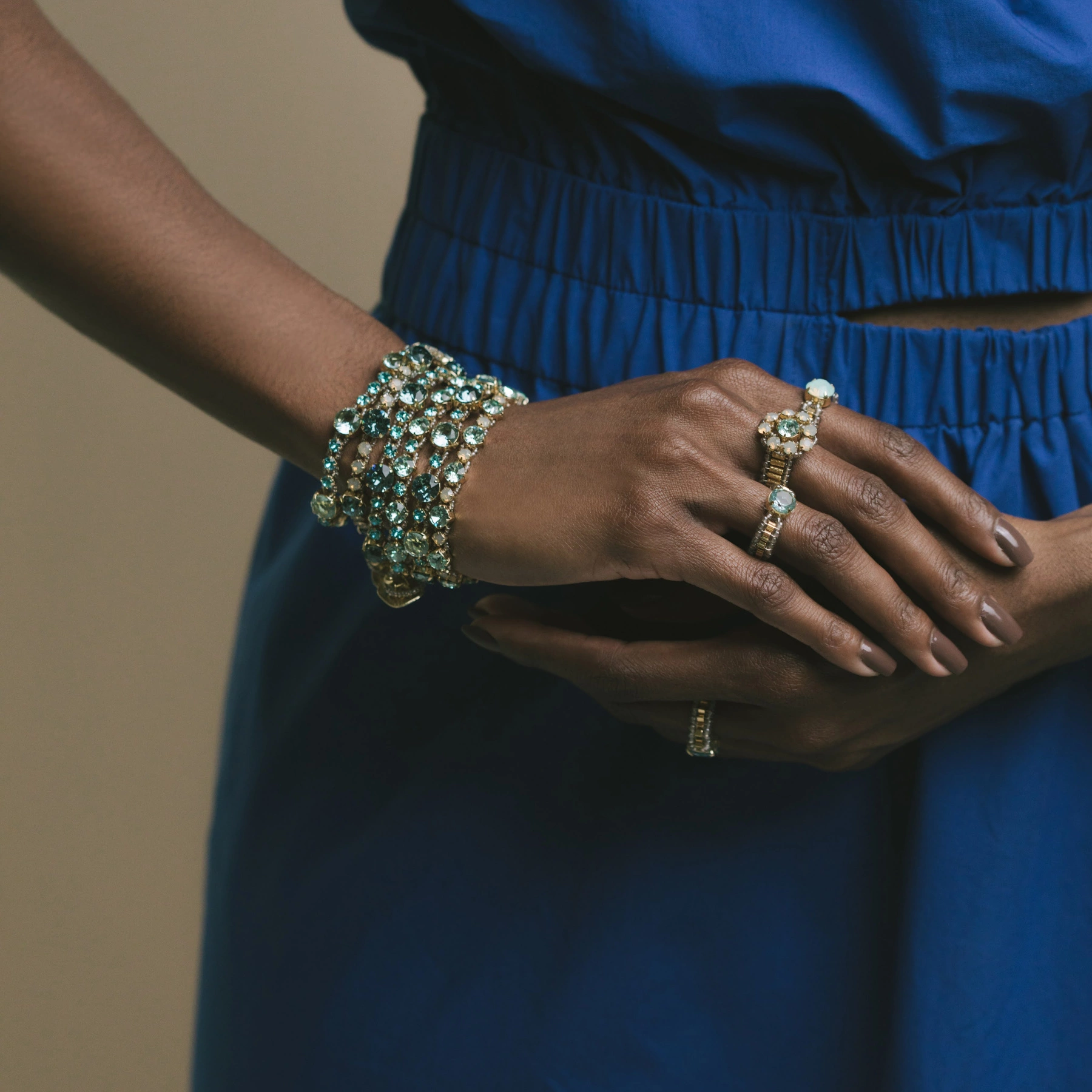 • Bransoletka na żyłce z błękitnych kryształów Swarovskiego w oprawach z mosiądzu platerowanego złotem i szklanych przezroczystych koralików, z efektownym zapięciem. Rękodzieło z pracowni w Sao Paulo