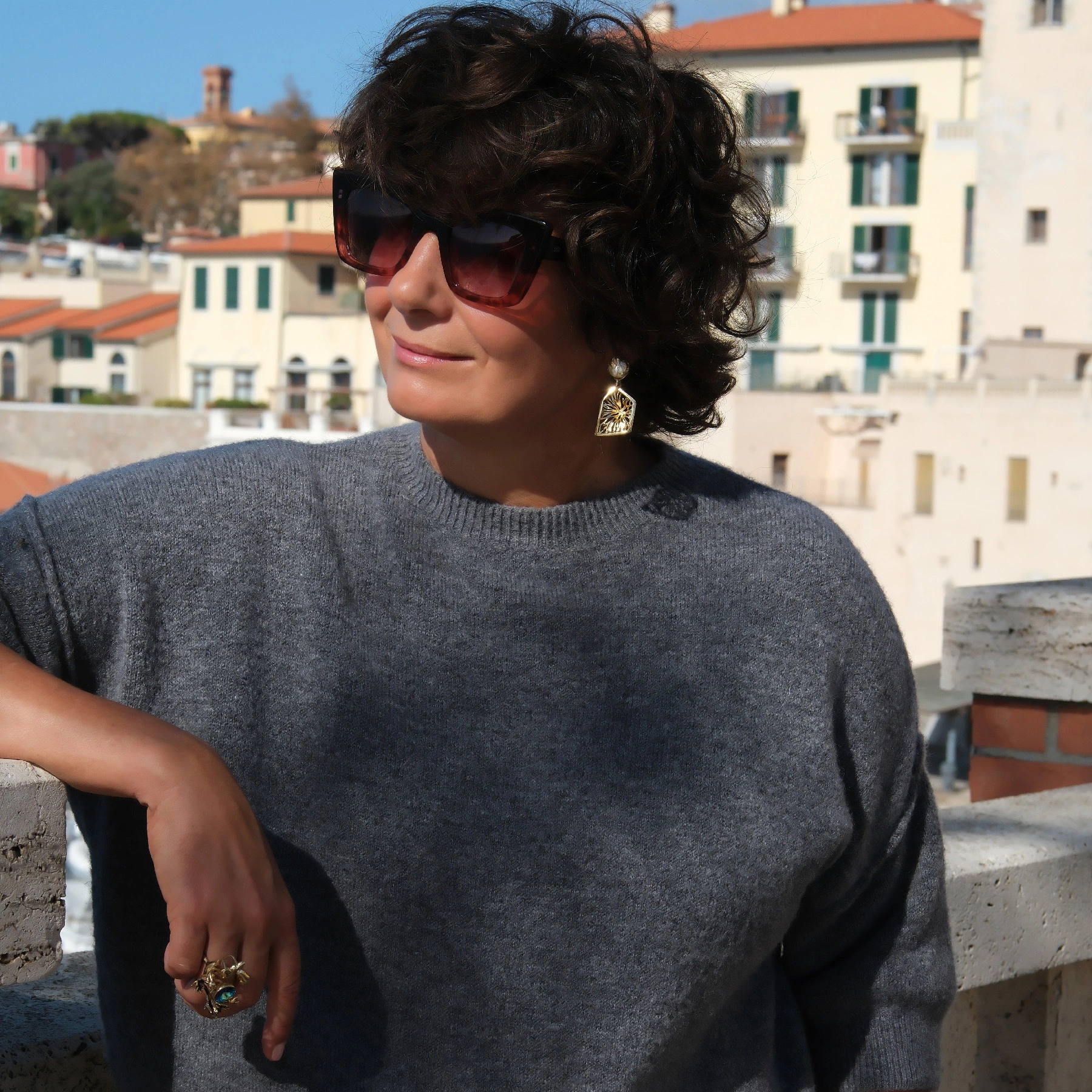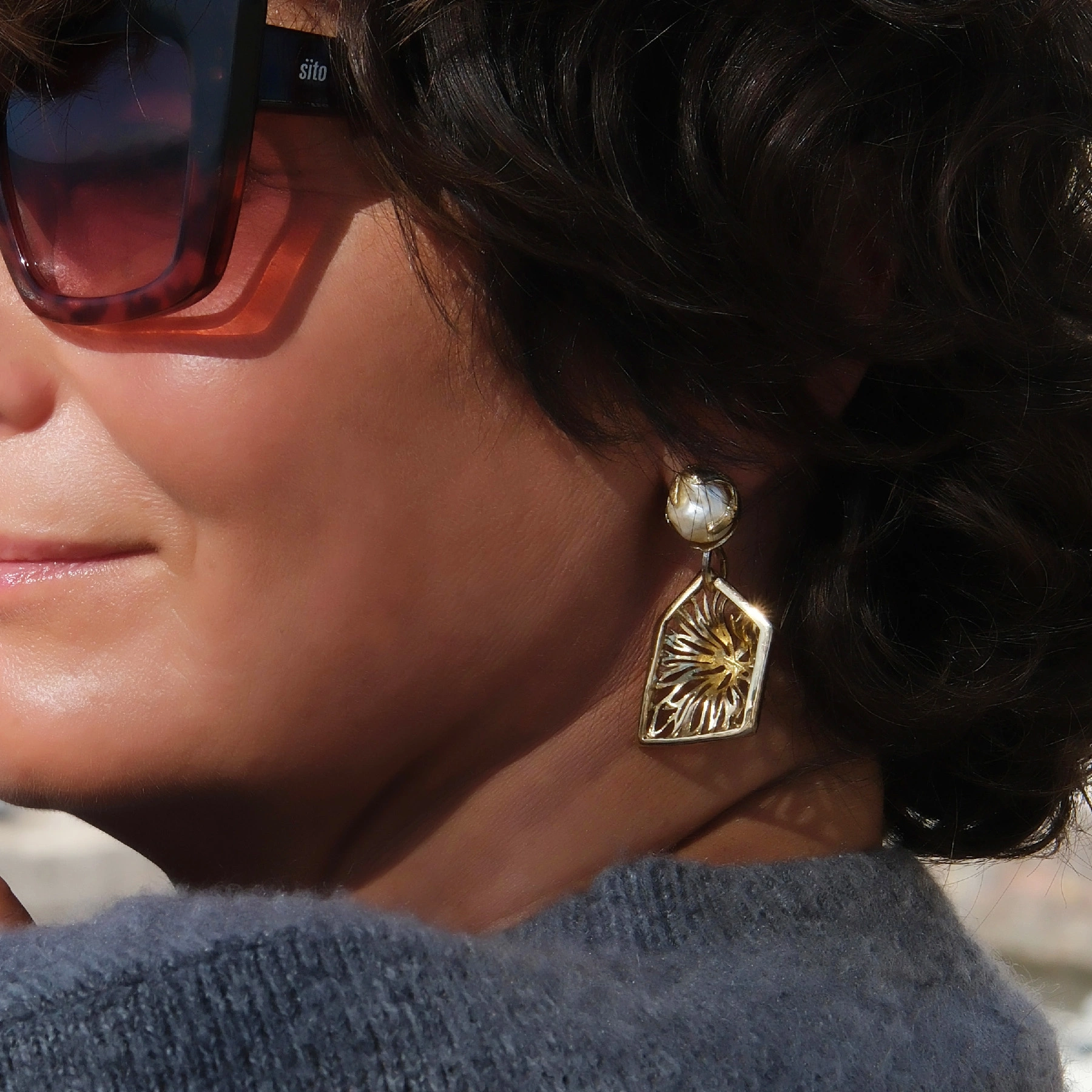 • Ultralekkie kolczyki typu sztyfty wykonane ręcznie z brązu platerowanego jasnym, wyjątkowo kobiecym złotem, z bazą z kremowo-różową perłą w delikatnej oprawie i zawieszką w kształcie nieregularnej ramy z ażurowym wzorem. Rękodzieło artystów z Aten.