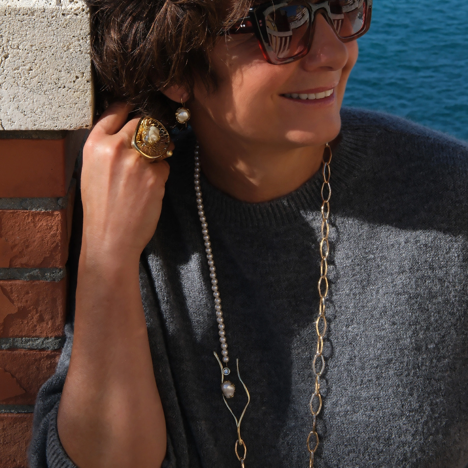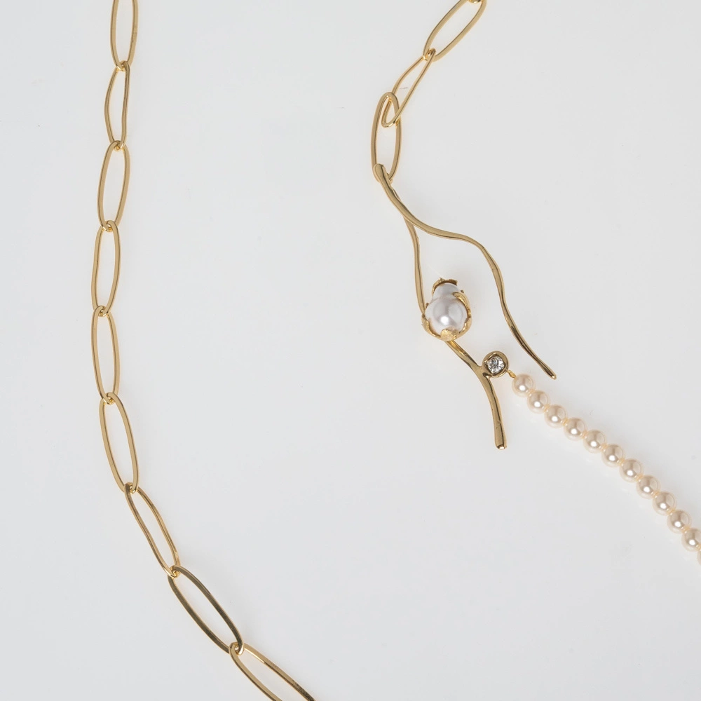 Pozłacany naszyjnik z pereł i łańcucha z ozdobną gałązką