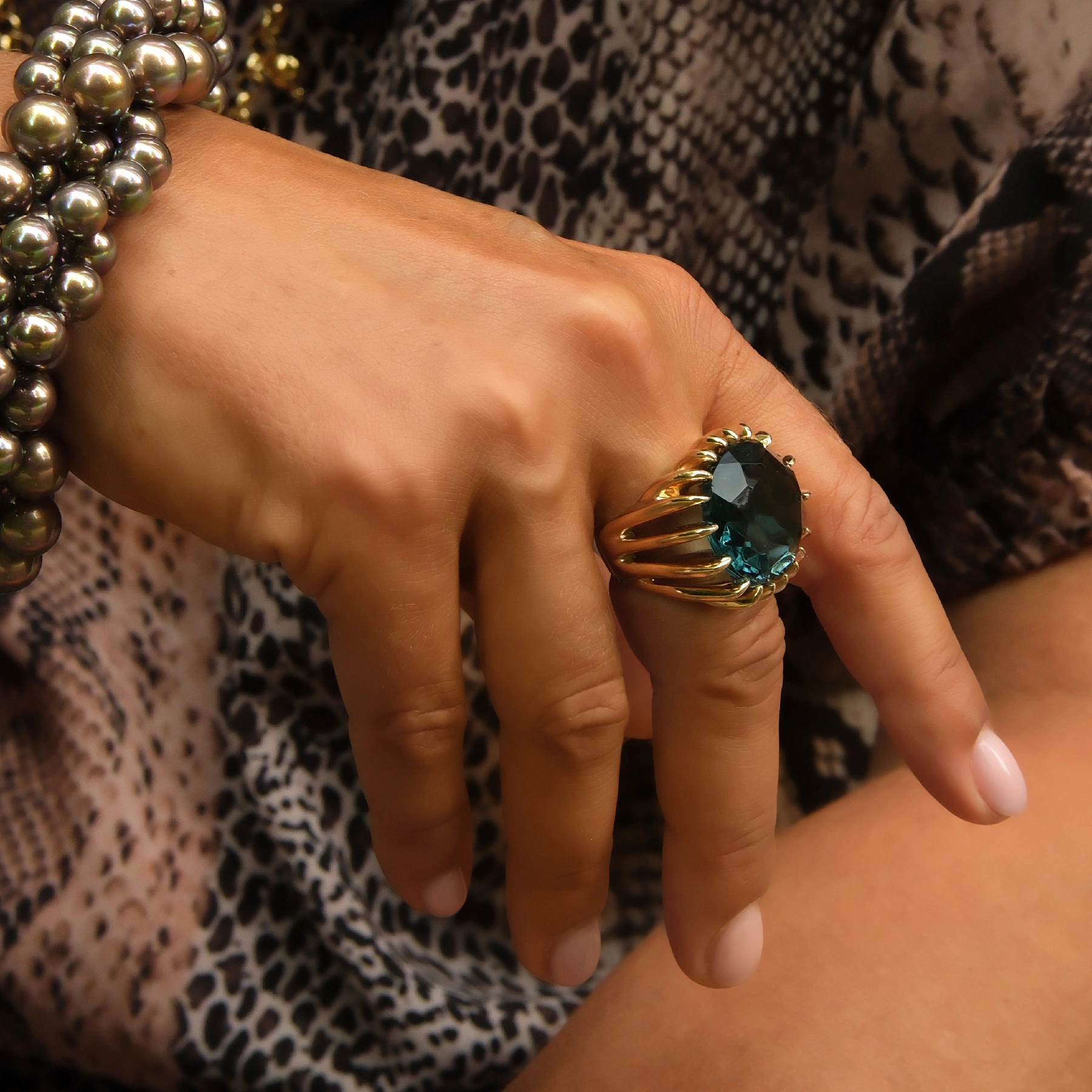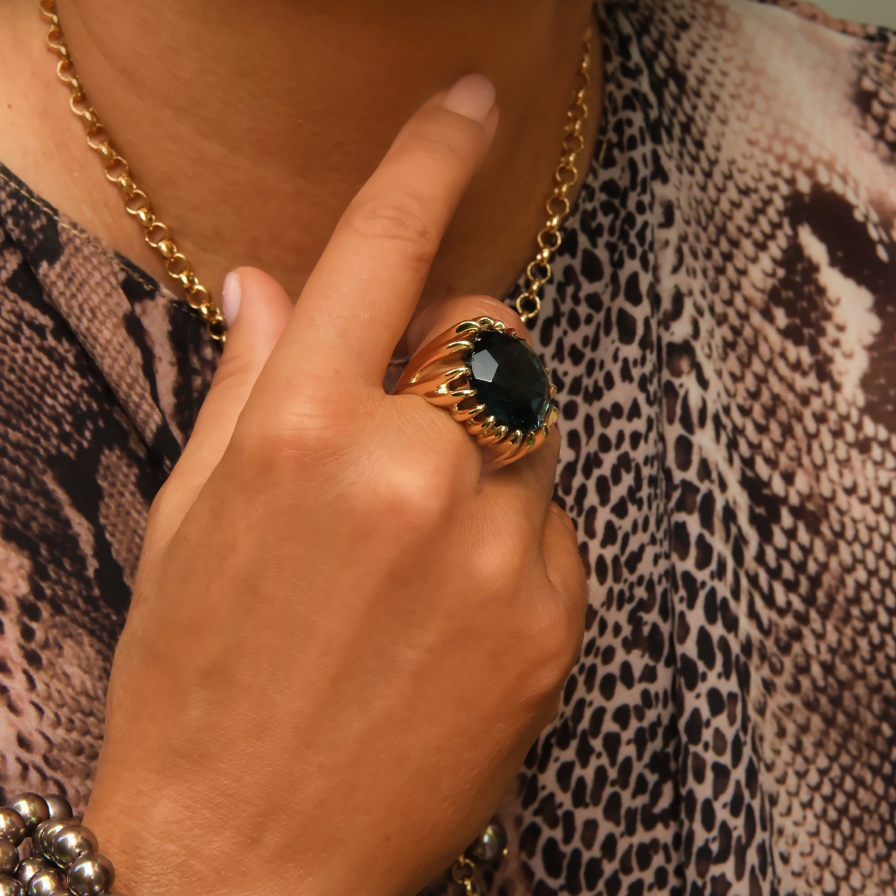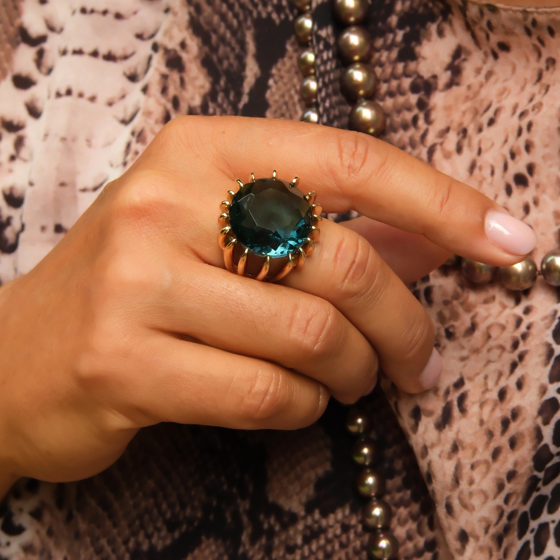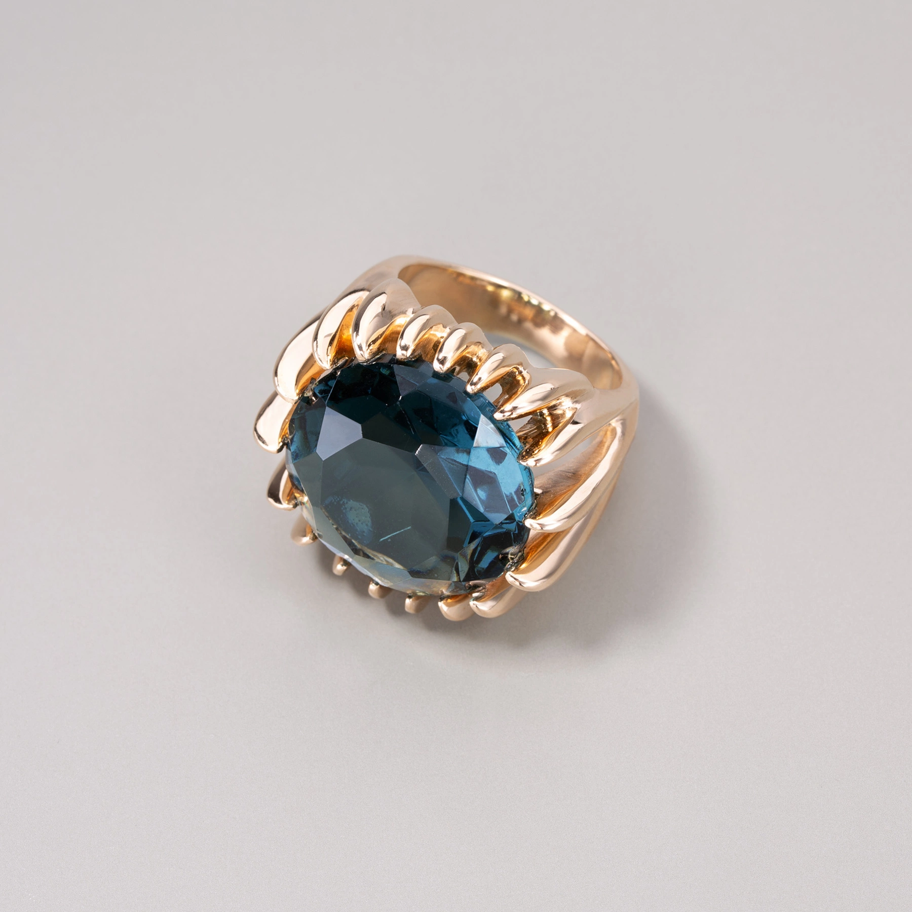 Pozłacany pierścionek z kryształem w morskim odcieniu
