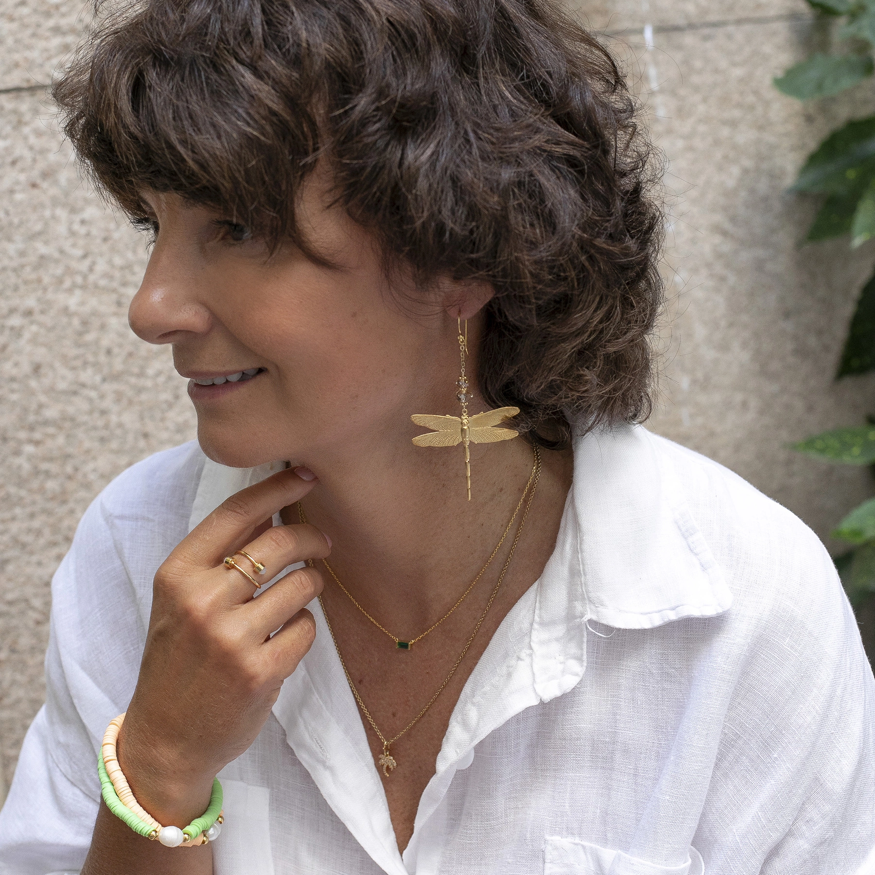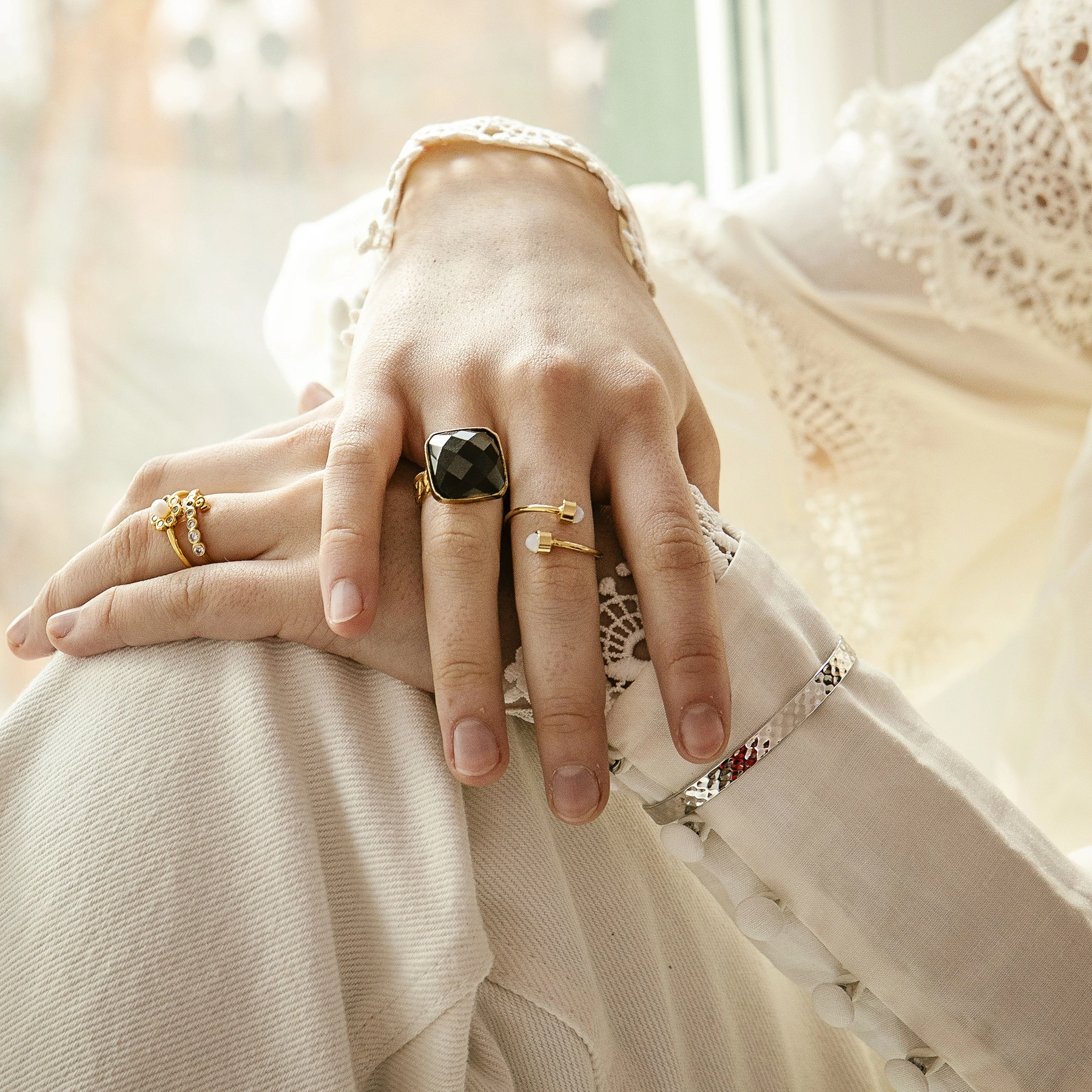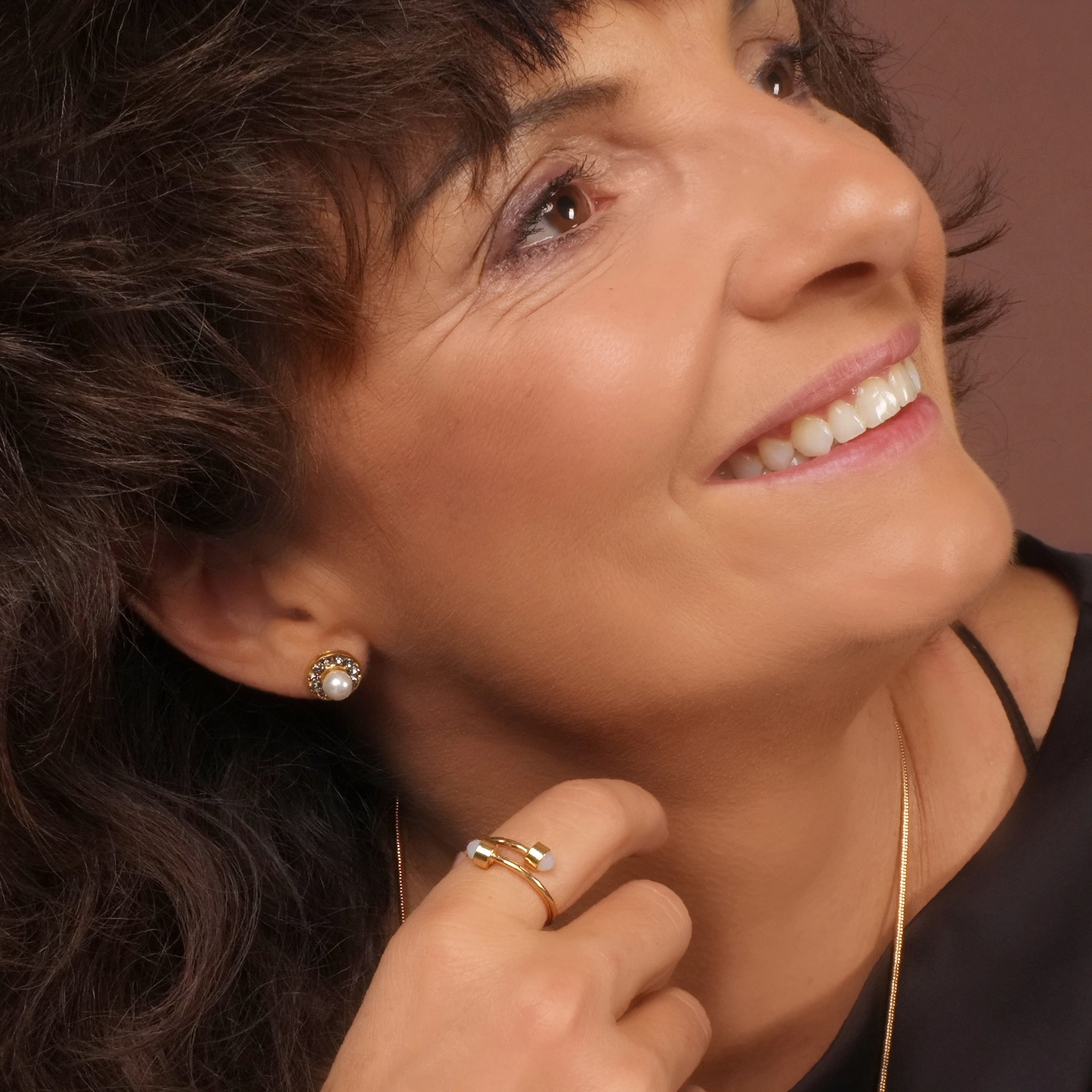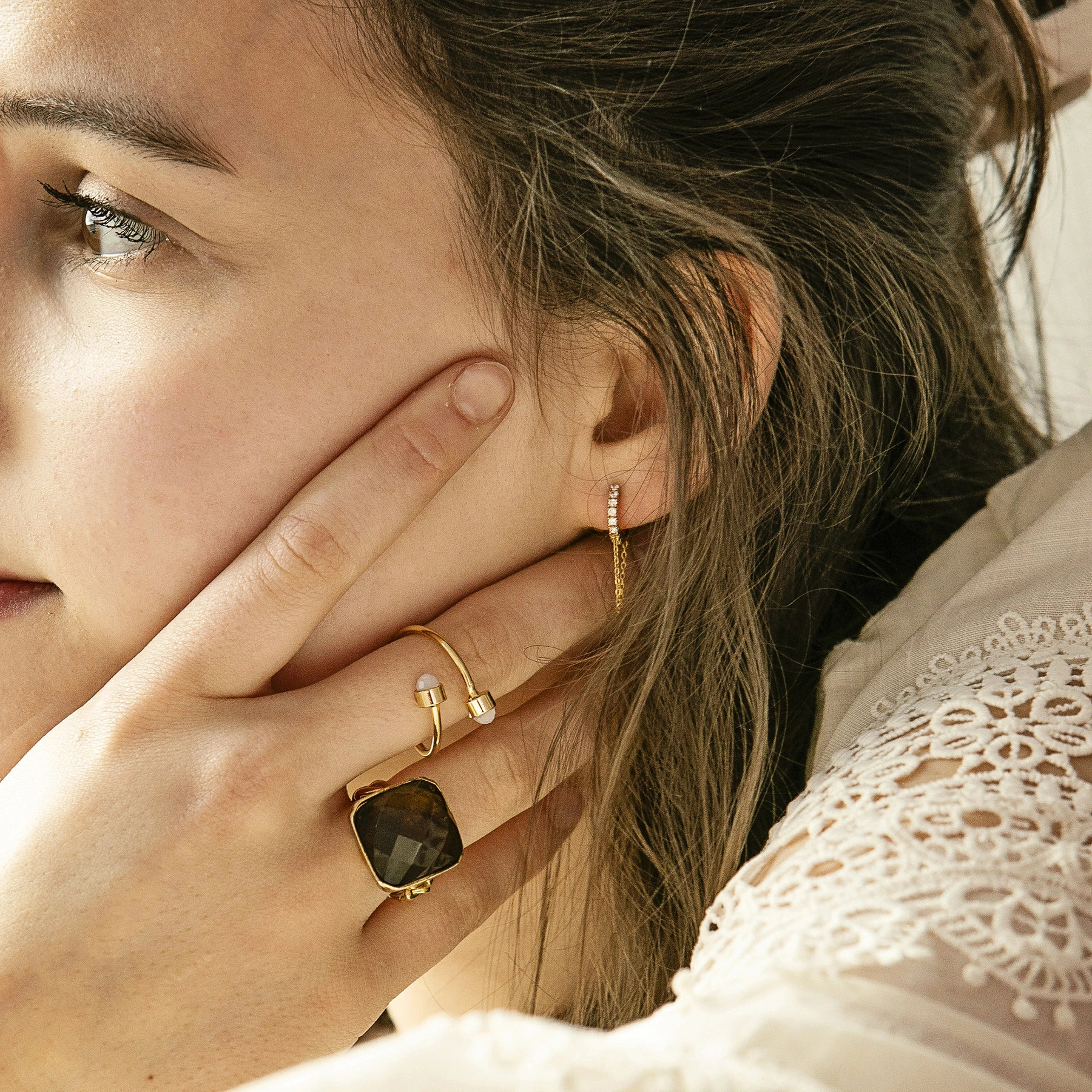 • Subtelny regulowany pierścionek z pozłacanego mosiądzu zdobiony dwoma opalowymi kryształami mieniącymi się zimną bielą. Zachwycający swoją prostą formą. Przepięknie wygląda na dłoni. Wysmukla ją, dodaje kobiecości. Dla minimalistek.