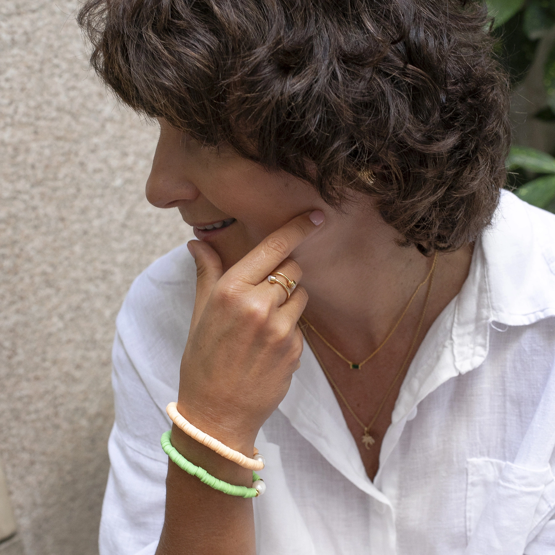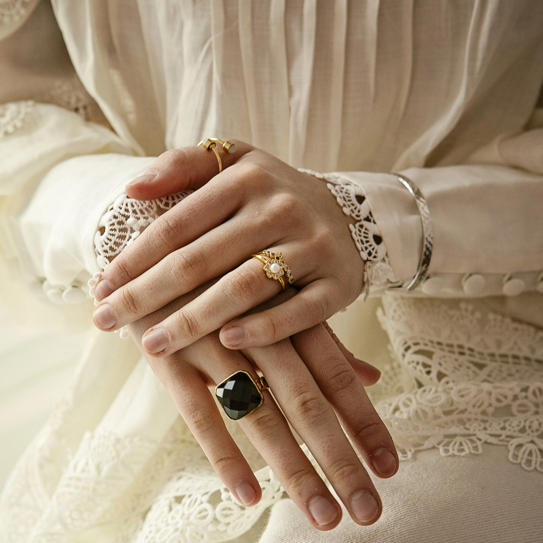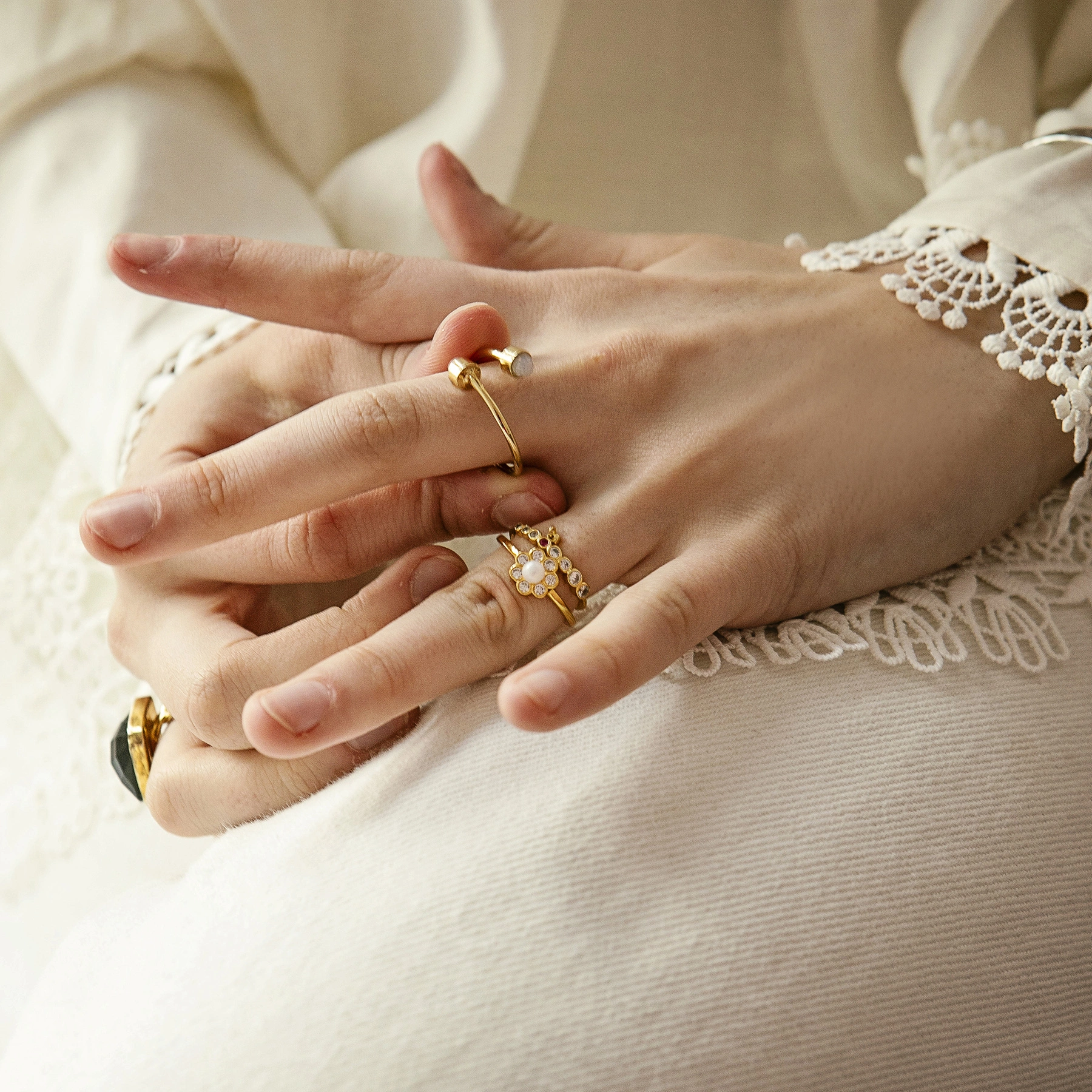• Subtelny regulowany pierścionek z pozłacanego mosiądzu zdobiony dwoma opalowymi kryształami mieniącymi się zimną bielą. Zachwycający swoją prostą formą. Przepięknie wygląda na dłoni. Wysmukla ją, dodaje kobiecości. Dla minimalistek.