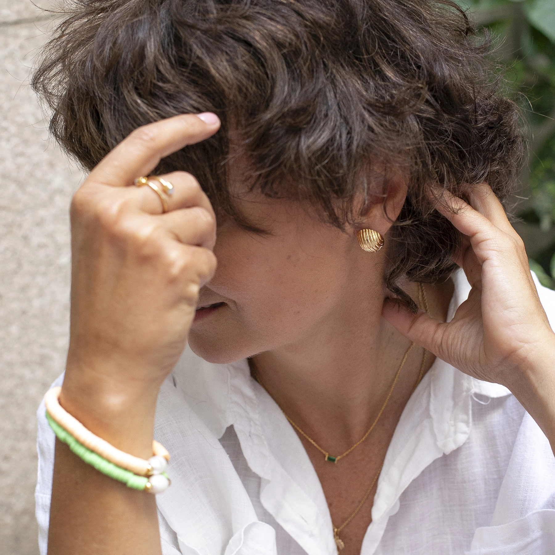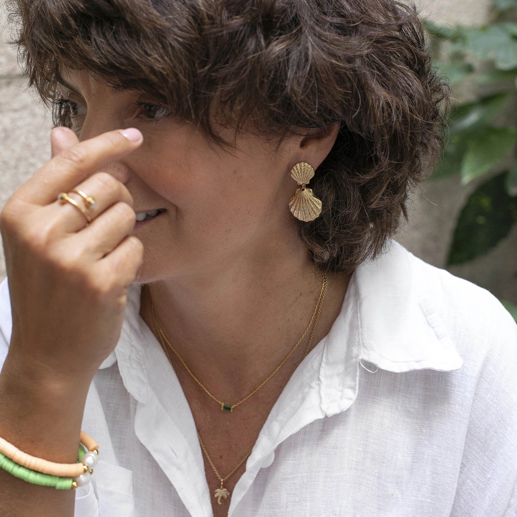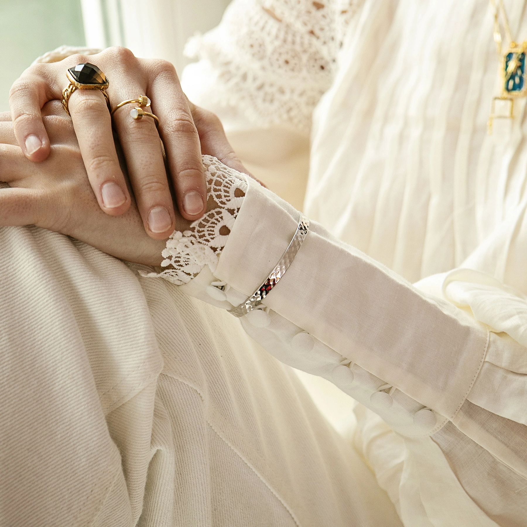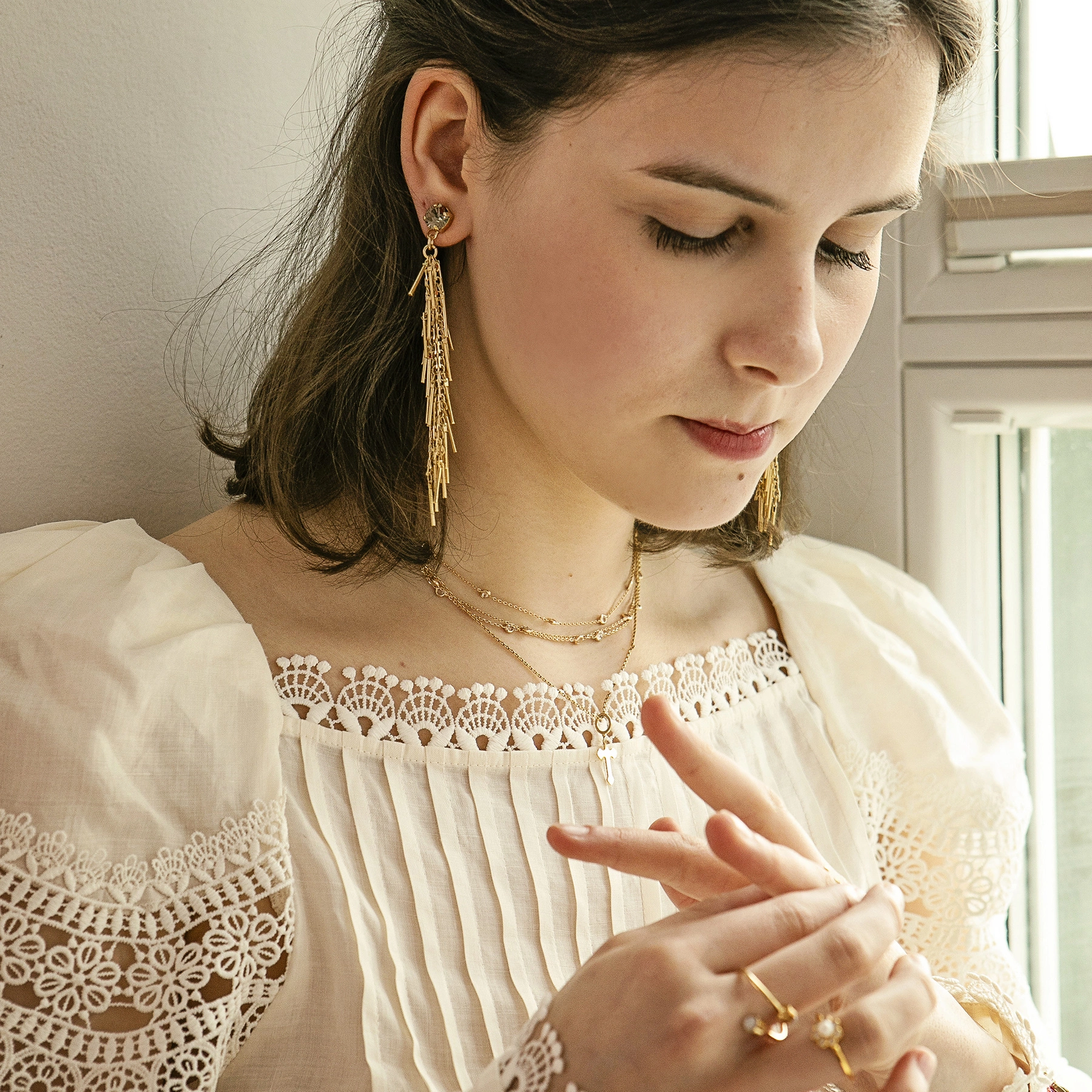 • Subtelny regulowany pierścionek z pozłacanego mosiądzu zdobiony dwoma opalowymi kryształami mieniącymi się zimną bielą. Zachwycający swoją prostą formą. Przepięknie wygląda na dłoni. Wysmukla ją, dodaje kobiecości. Dla minimalistek.