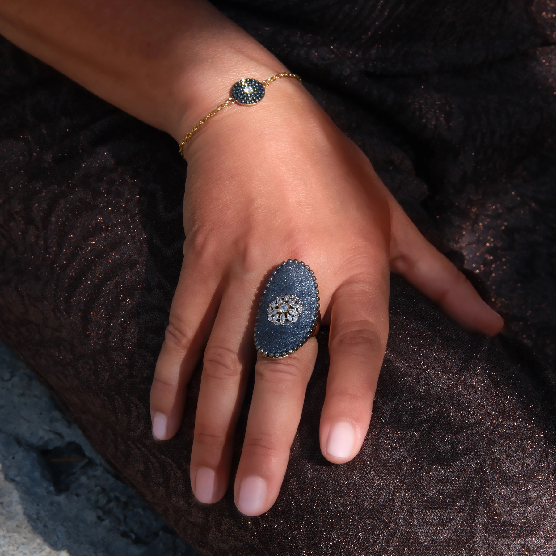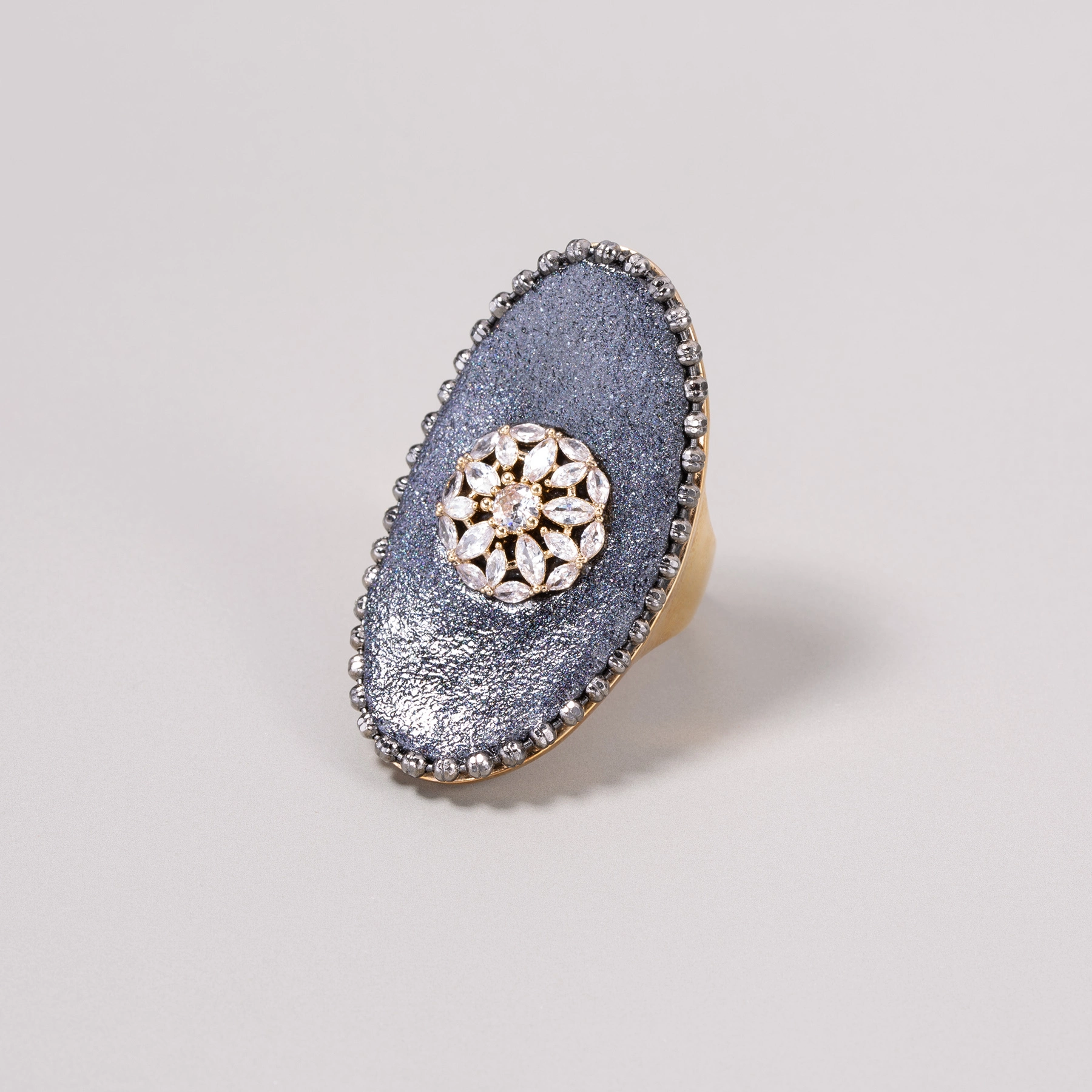 • DOSTĘPNY NA ZAMÓWIENIE. CZAS REALIZACJI OKOŁO 21 DNI. Efektowny pierścionek z pozłacanego bezniklowego mosiądzu z okazałym dekorem z dwuskładnikowej ceramiki pigmentowanej proszkiem nadającym połysk, a następnie emaliowanej, z ozdobnym ornamentem.