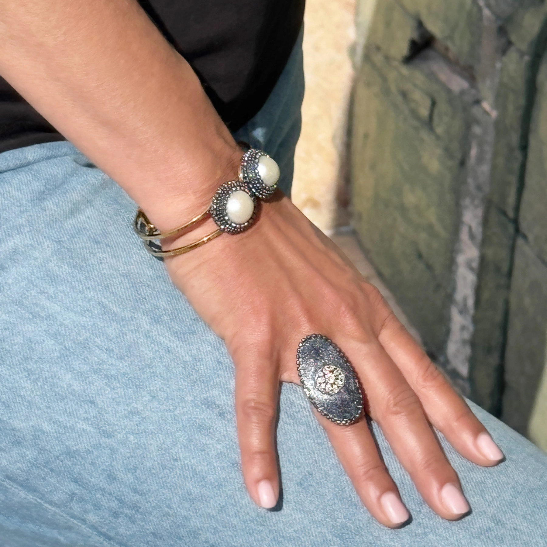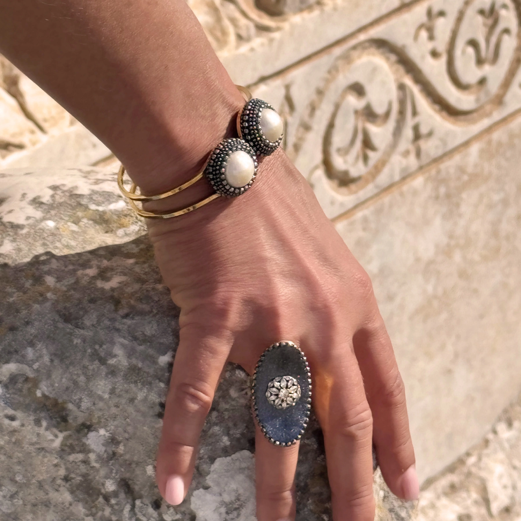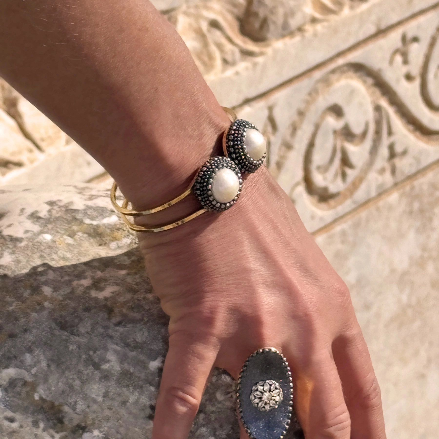 Daniela i jej mąż Francesco to przemiła para pasjonatów biżuterii. Ponad 10 lat temu otworzyli jubilerską pracownię w małym miasteczku w samym sercu Umbrii, krainy oliwy, wina i mody. Długo eksperymentowali z różnymi tworzywami, aby w końcu osiągnąć zamierzony efekt. Wykonywane przez nich niektóre wyroby wymagają specjalnej techniki konstrukcyjnej. Polega ona na pokrywaniu bazy z pozłacanego mosiądzu dwuskładnikową żywicą. Następnie jest ona pigmentowana proszkiem nadającym jej połysk i emaliowana. W dalszej kolejności w zależności od projektu aplikowane są na nią różne dekory. Podstawową ozdobę stanowią diamentowe łańcuszki tworzące oprawę dla pereł, kamieni naturalnych i motywów układanych z kryształków. To bardzo pracochłonna, całkowicie ręczna praca, za to skutkująca absolutnie unikatową biżuterią. Dodajmy, że bardzo wygodną. Bo jak wyznaje Daniela „Tworząc przedmiot, który podkreśla kobiece piękno, ważne jest, aby myśleć o komforcie jego noszenia”.