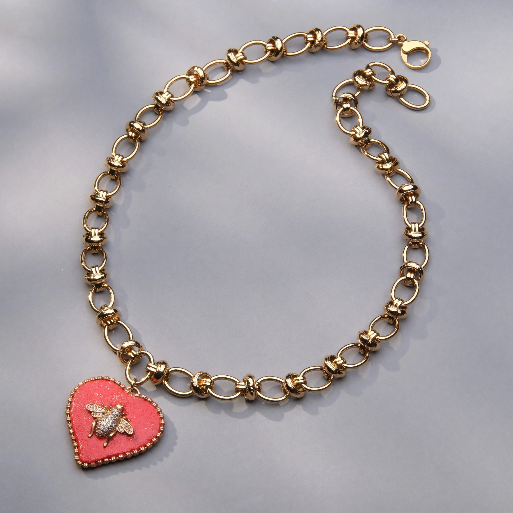 • Wisior na łańcuchu z ogniw z bezniklowego mosiądzu w kolorze vintage gold, z zawieszką-sercem z dwuskładnikowej pigmentowanej ceramiki pokrytej grubą warstwą czerwonej pasty z żywicy z motywem muszki z cyrkoniami i obwódką z diamentowych łańcuszków.