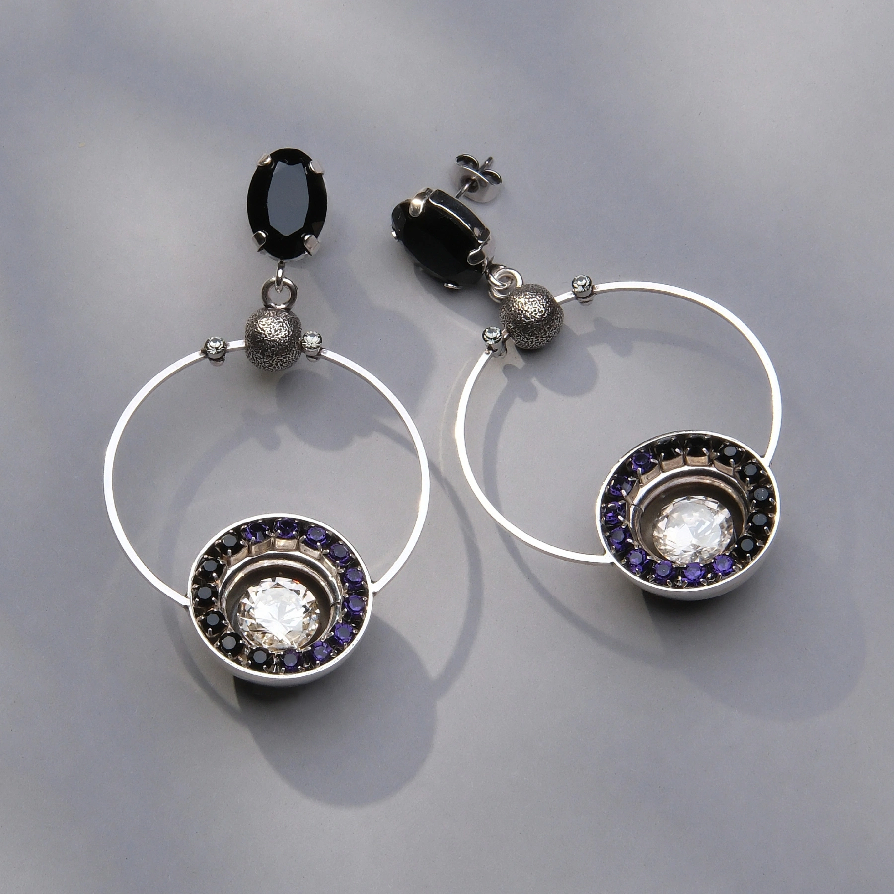Srebrzone kolczyki koła z kryształkami w czerni i fiolecie